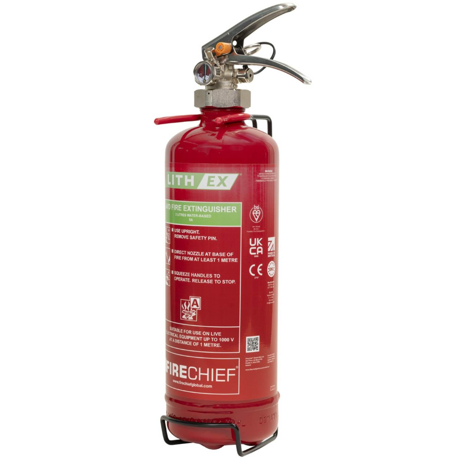 At present there is no standard for extinguishing Lithium batteries, however, the 2-litre Lith-Ex fire extinguisher is manufactured by FireChief in accordance with BS EN3, is CE Marked and has a 6-year warranty.
