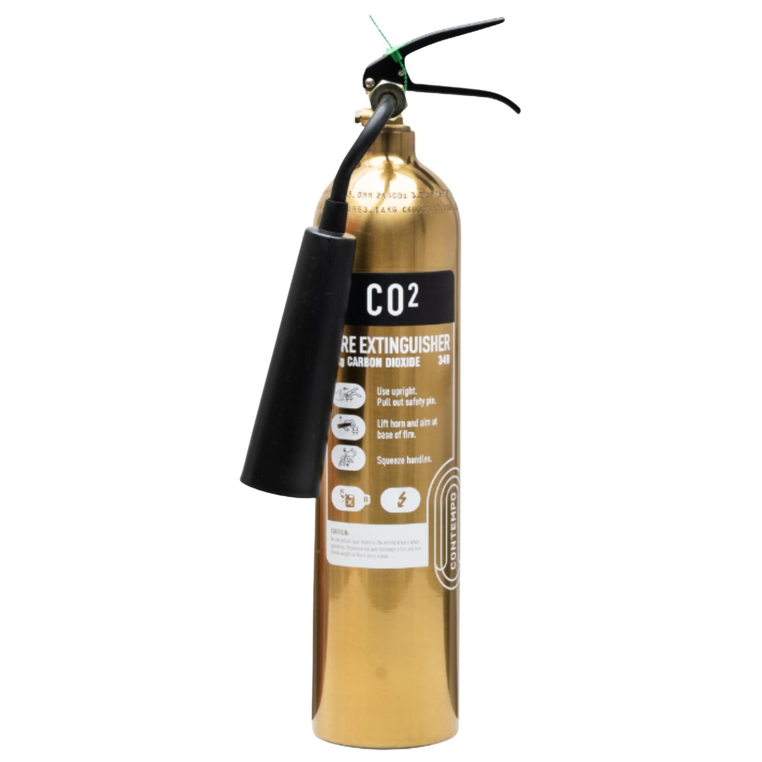 The Polished Gold 2kg CO2 Fire Extinguisher is part of Checkfire’s Contempo range of designer fire extinguishers. Combining form and function to the highest degree, this extinguisher will serve as a stylish and reliable solution to tackling Class B (flammable liquids) and electrical fires.