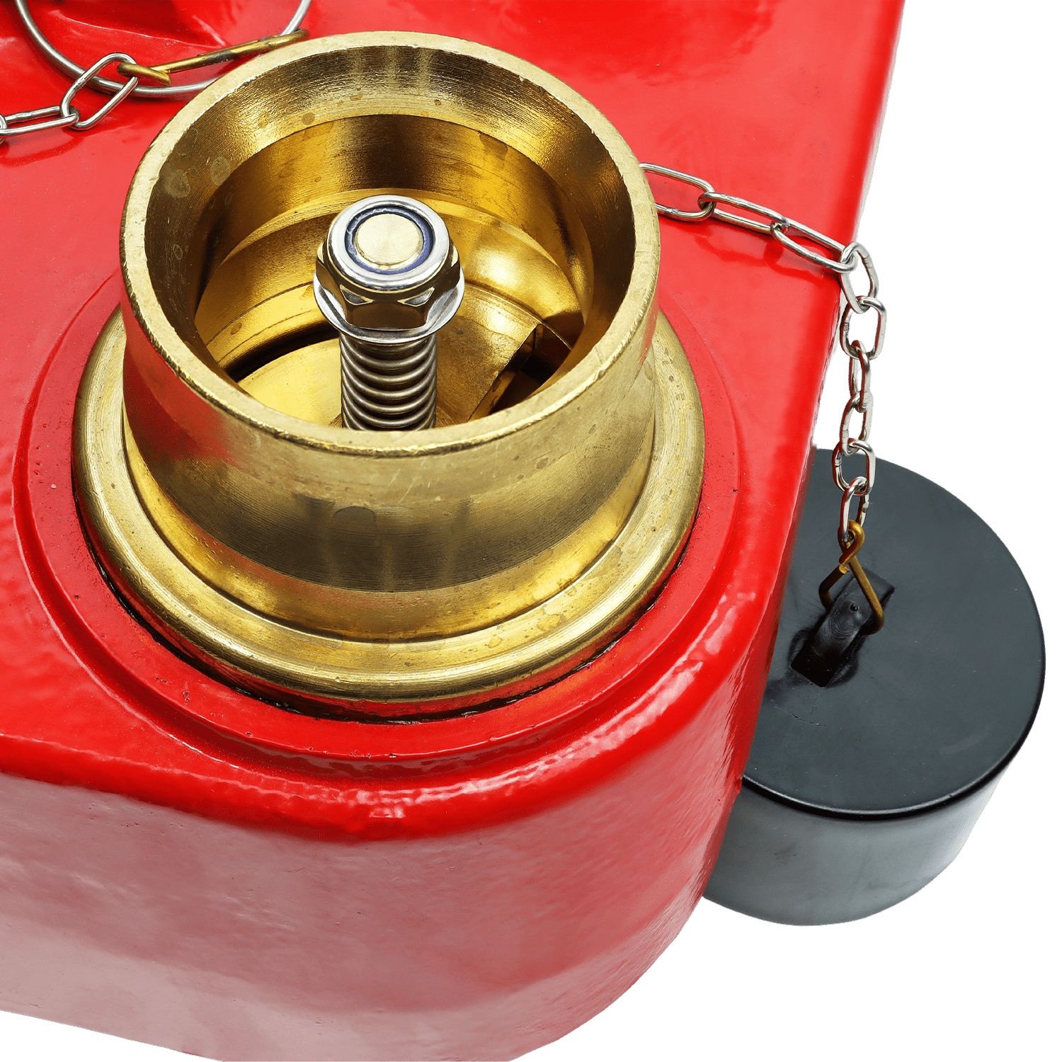 With a standard PN16 flange – you can tell by the 8 bolt holes at the base of the valve – the 4-way inlet breeching valve is suitable for installation in a vertical or horizontal position. Complete with caps and chains, the inlet valve has 4x 2½” instantaneous male non-return valve inlets, fits standard UK fire brigade (BS336-type) connections, a 152mm PN16 outlet flange and a 1” drain valve.