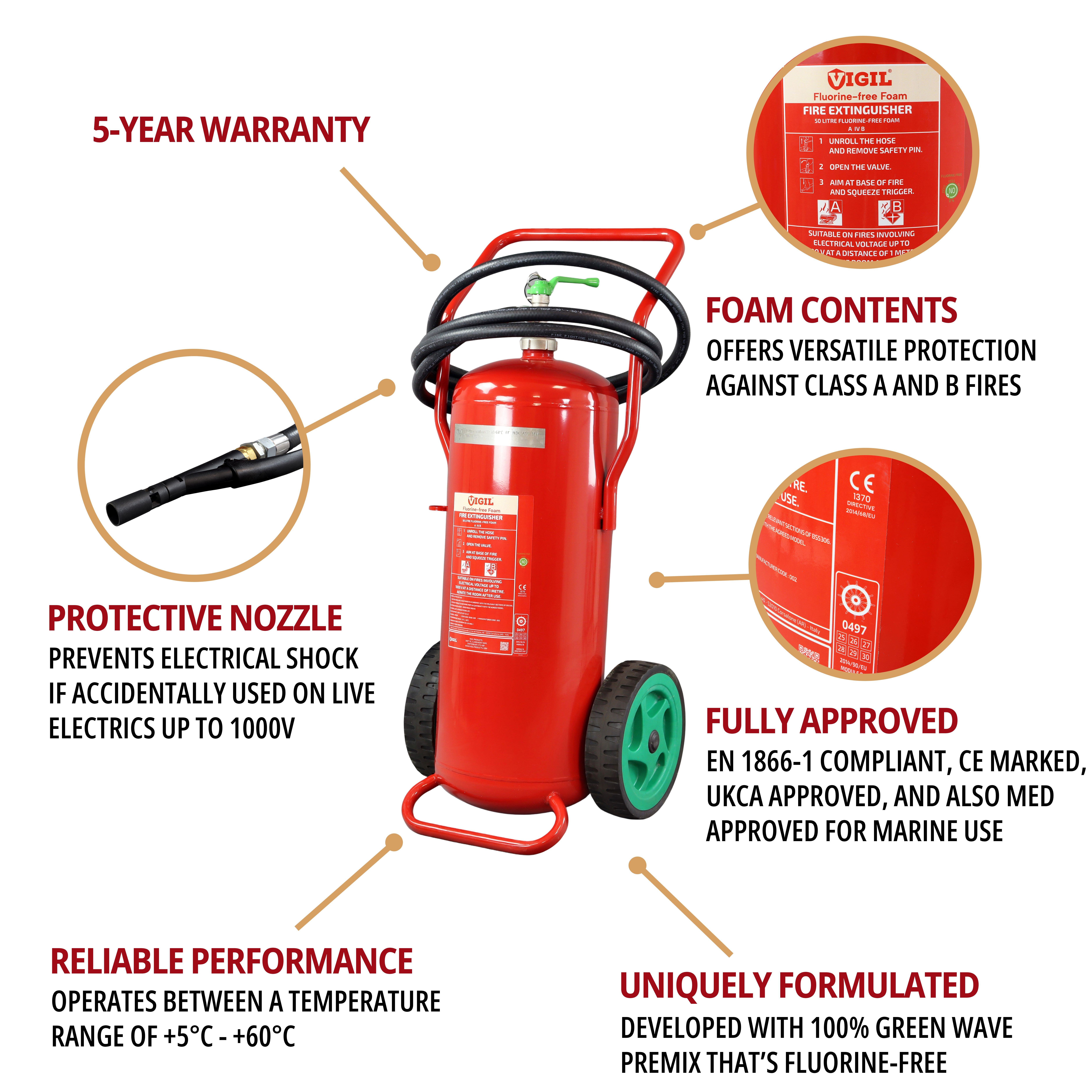 Manufactured by Vigil Products, it has a 50-litre capacity and is mounted on a rugged wheeled frame. It is built to cover large areas quickly and can handle multiple fire points. Despite its size, it's designed for ease of use by a single operator and offers heavy-duty protection wherever rapid response is needed most.