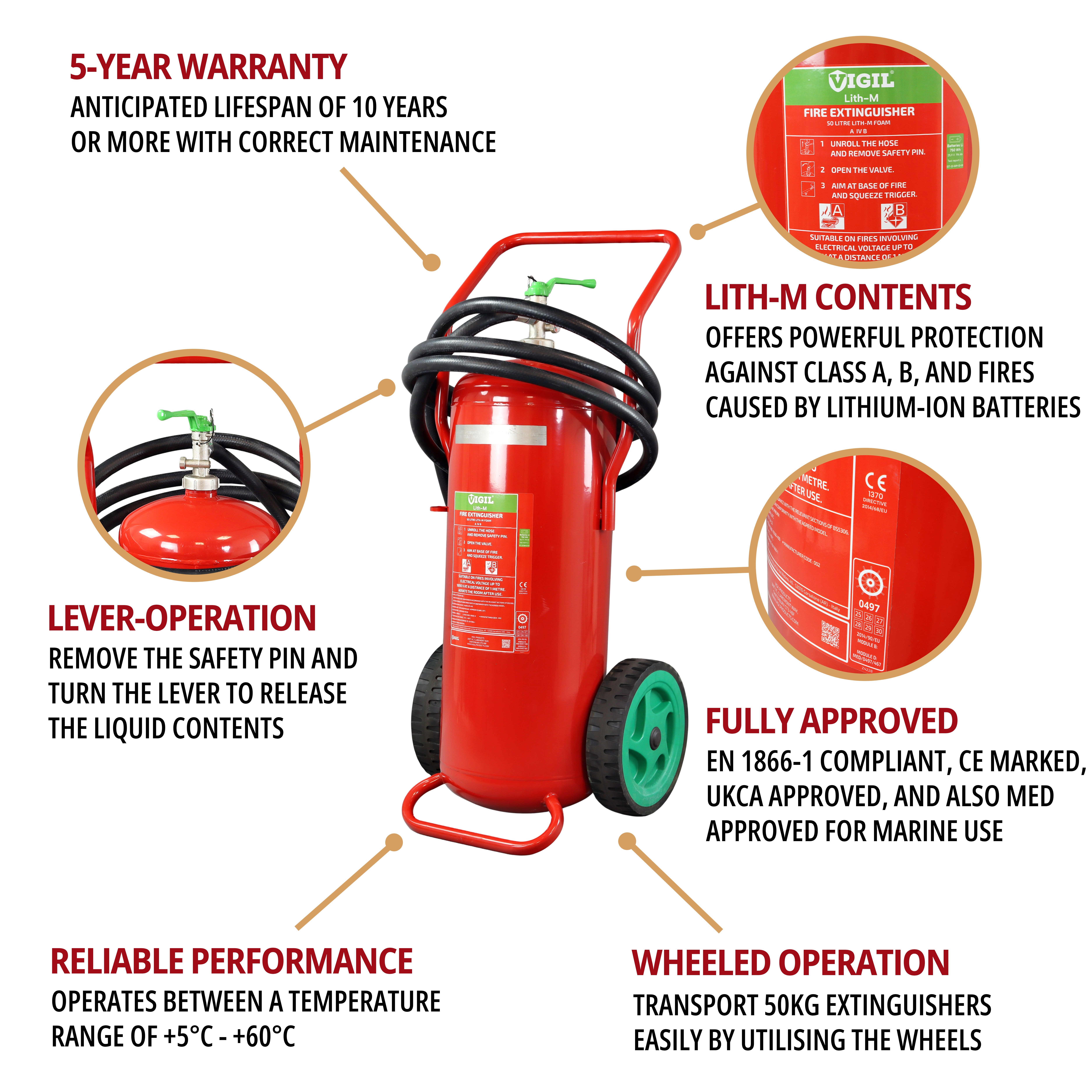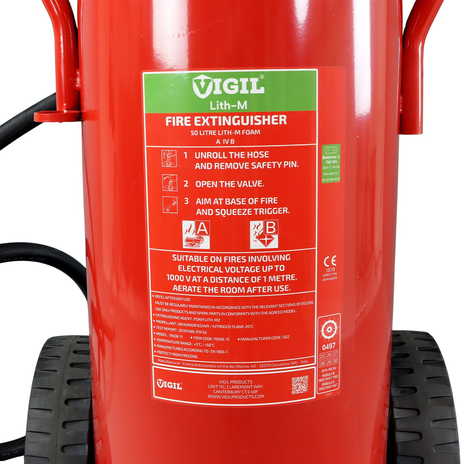 Designed for the most demanding settings, the 50-litre wheeled Lith-M fire extinguisher delivers cutting-edge protection against the growing threat of lithium-ion battery fires over 750 Wh. From battery storage warehouses to manufacturing plants and energy facilities, it provides powerful, targeted fire suppression right where it’s needed most.