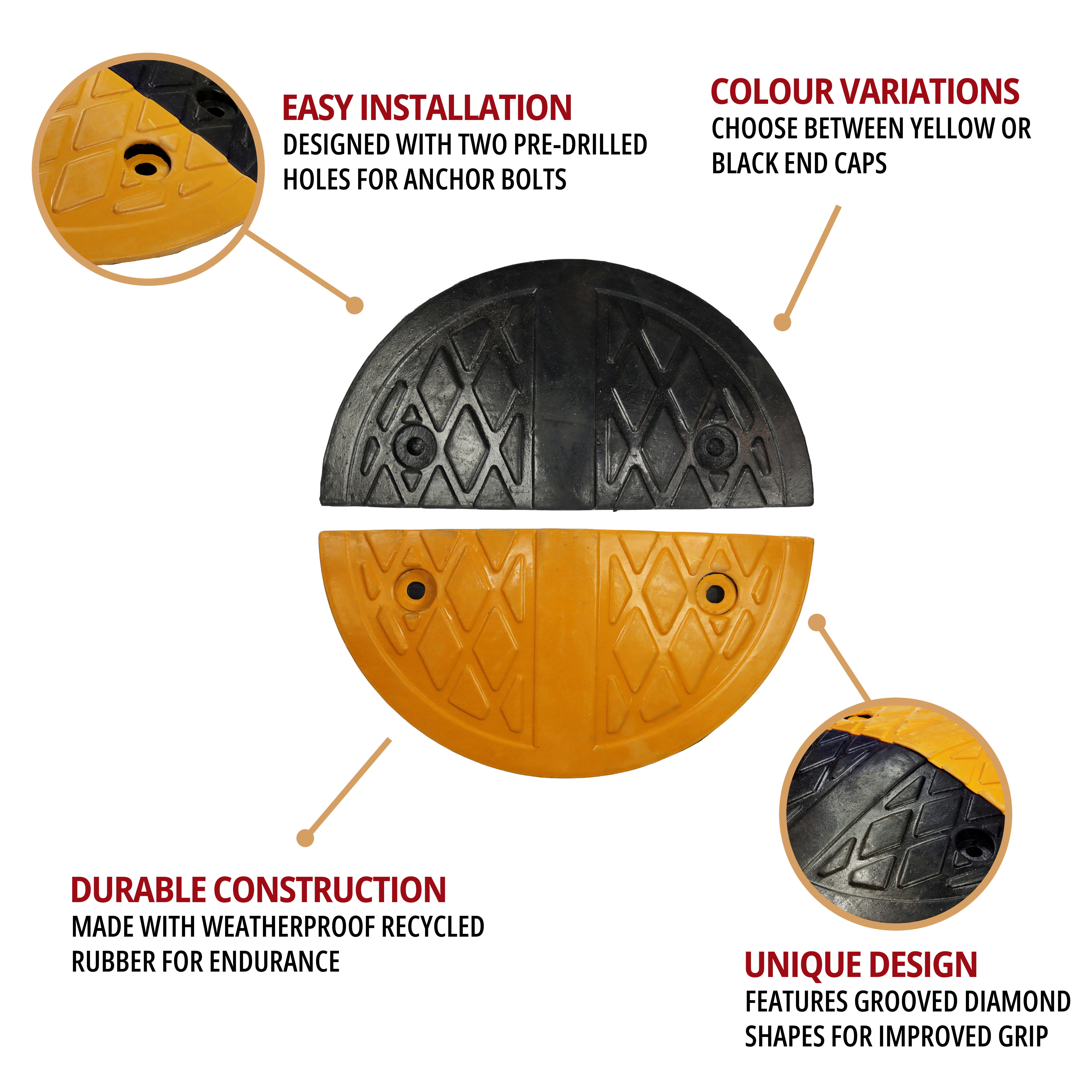 Each supplied with two pre-drilled holes, they are constructed of highly durable recycled rubber with grooved diamond shapes for improved water drainage and grip. With a height of 70mm designed to reduce the speed of cars, vans and HGV lorries down to 5mph, each cap measures 180mm long and 350mm wide.