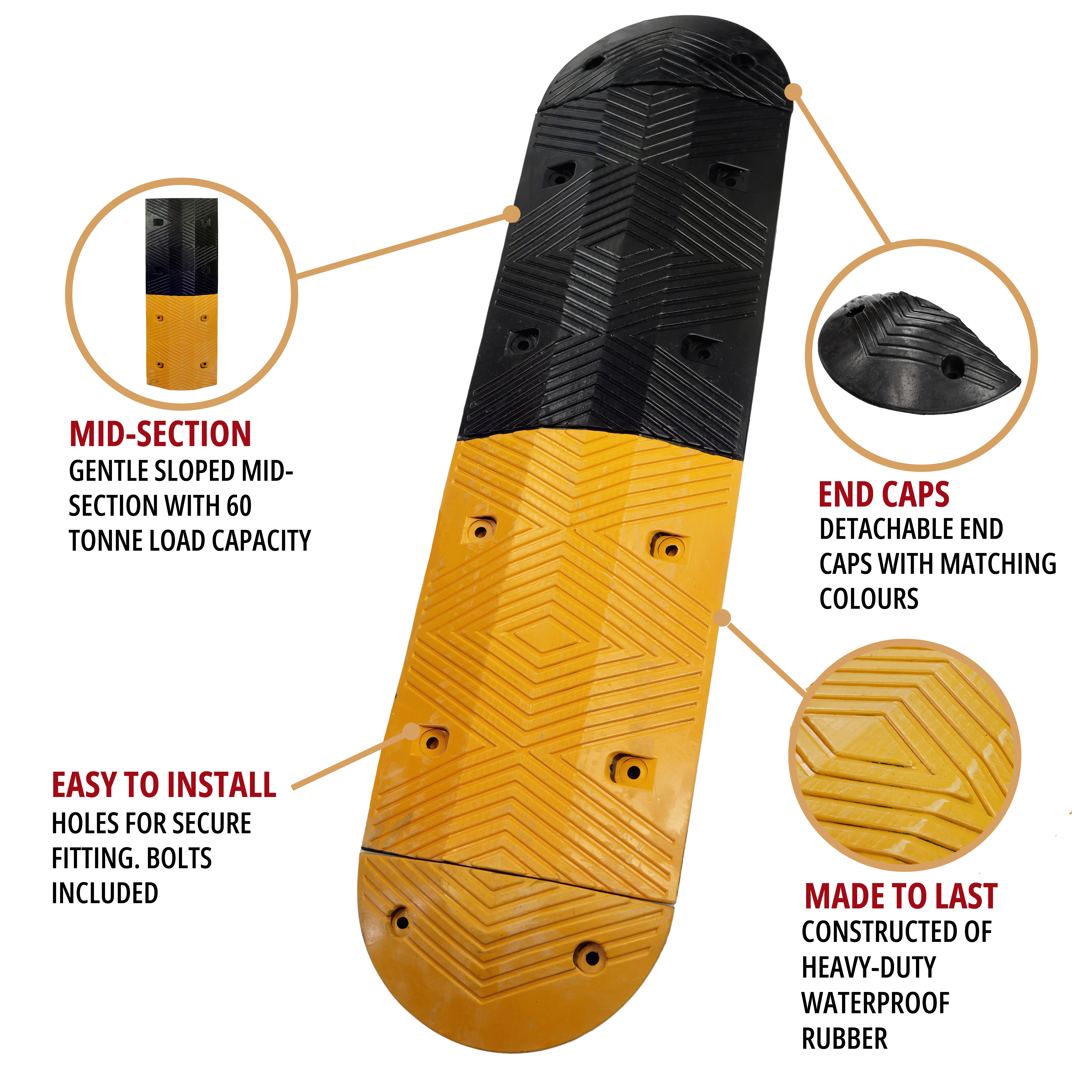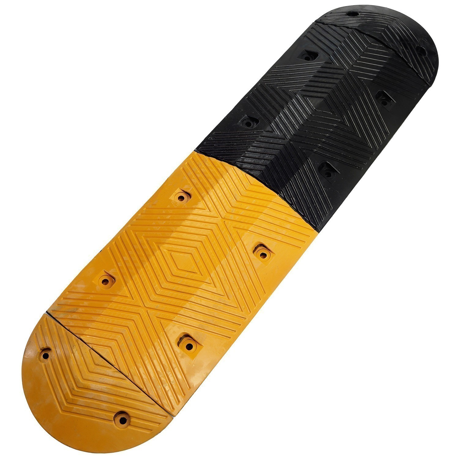 Reducing accidents and preventing injuries with lower speeds, the highly visible yellow and black contrasting colours, combined with cats eye reflectors, ensure they’re visible day and night. Constructed of highly durable recycled rubber, it features grooved diamond shapes for improved water drainage and grip, and is UV, moisture, and temperature resistant.