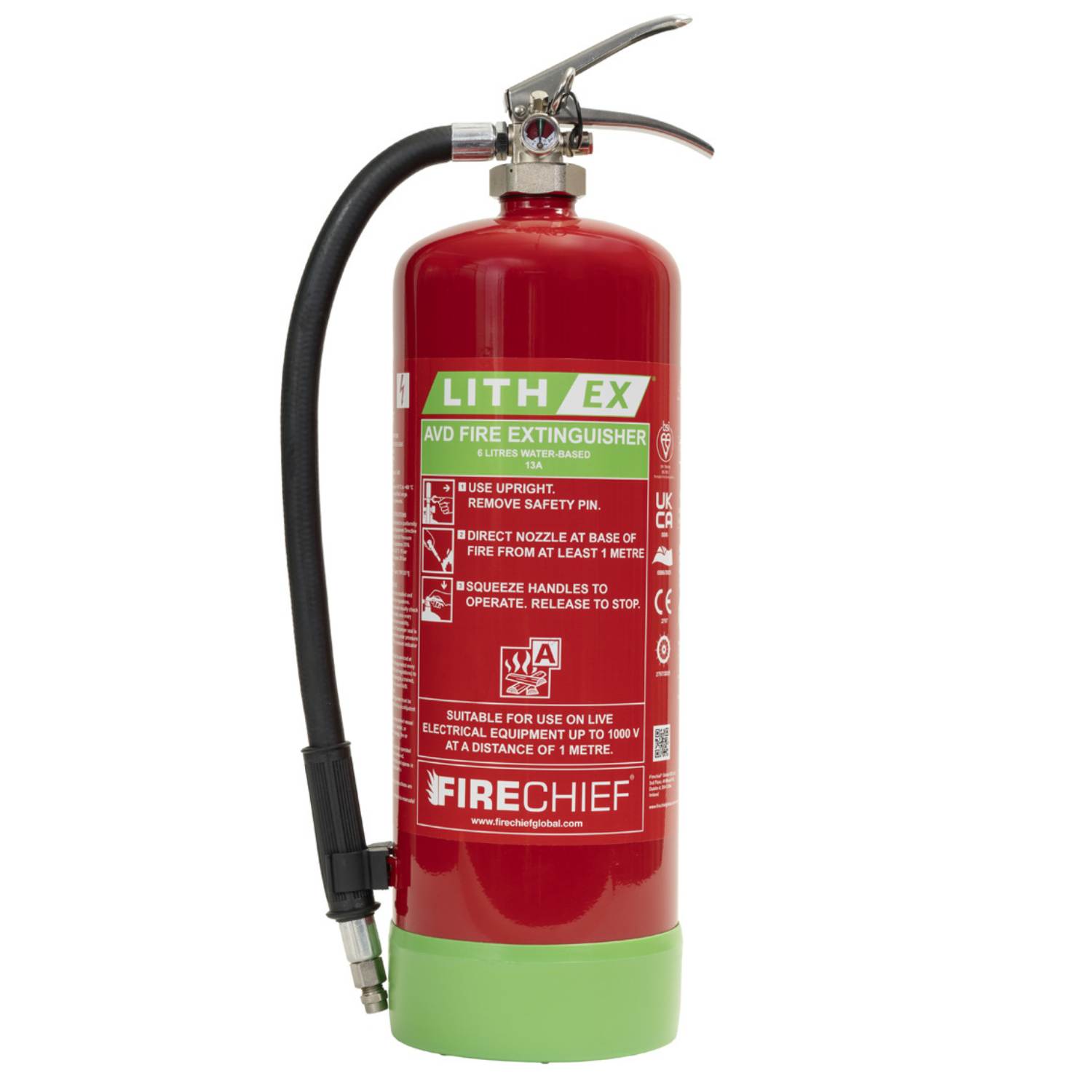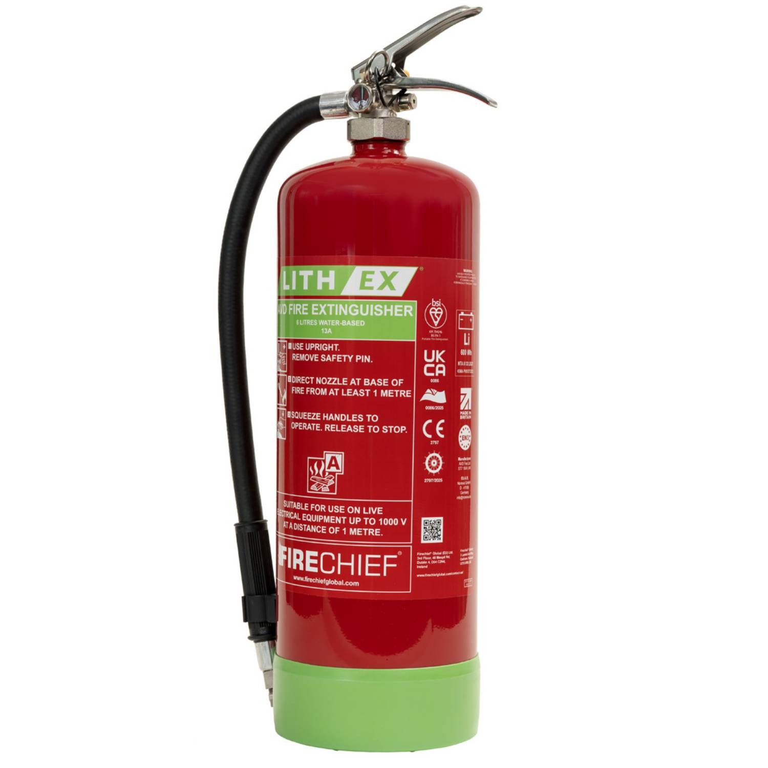 At present there is no standard for extinguishing Lithium batteries, however, the 6-litre Lith-Ex fire extinguisher is manufactured by FireChief in accordance with BS EN3, is CE Marked and has a 5-year warranty.