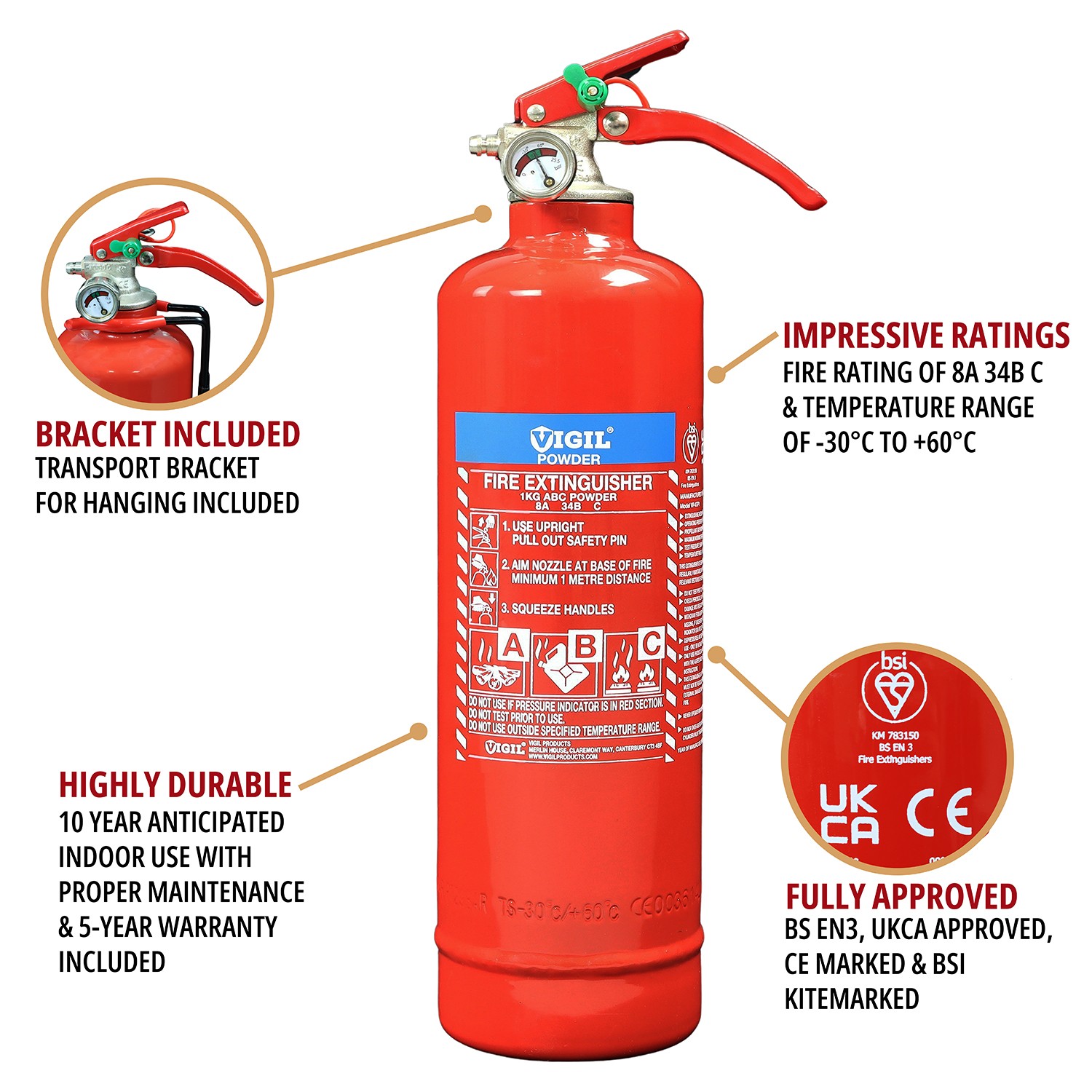 Supplied with a transport bracket, as standard, which makes it easy to install onto a wall or the inside of your vehicle, the 1kg Powder Extinguisher also has a 5-year warranty with UKCA approval, CE Marked and the BSI Kitemark too. This means you get a fire extinguisher you know you can rely on.