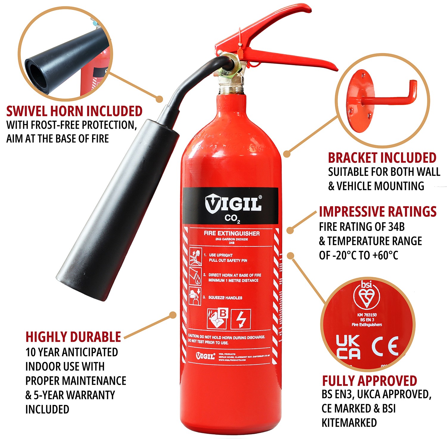Manufactured for Vigil Products as part of their growing range, this 2kg CO2 Extinguisher actually benefits from having a stumpy design which makes it less prone to toppling over like taller CO2 extinguishers on the market. Filled with carbon dioxide, it’s lightweight but will be an essential part of your fire risk assessment requirements, especially when partnered alongside a water or foam extinguisher for all-round protection.