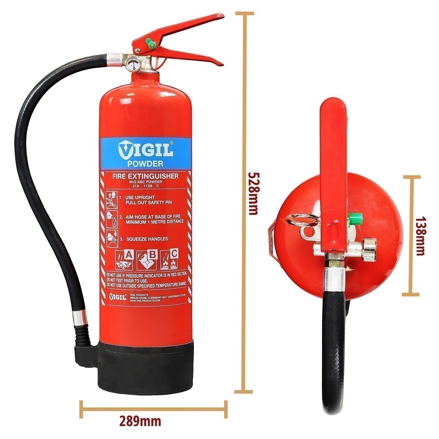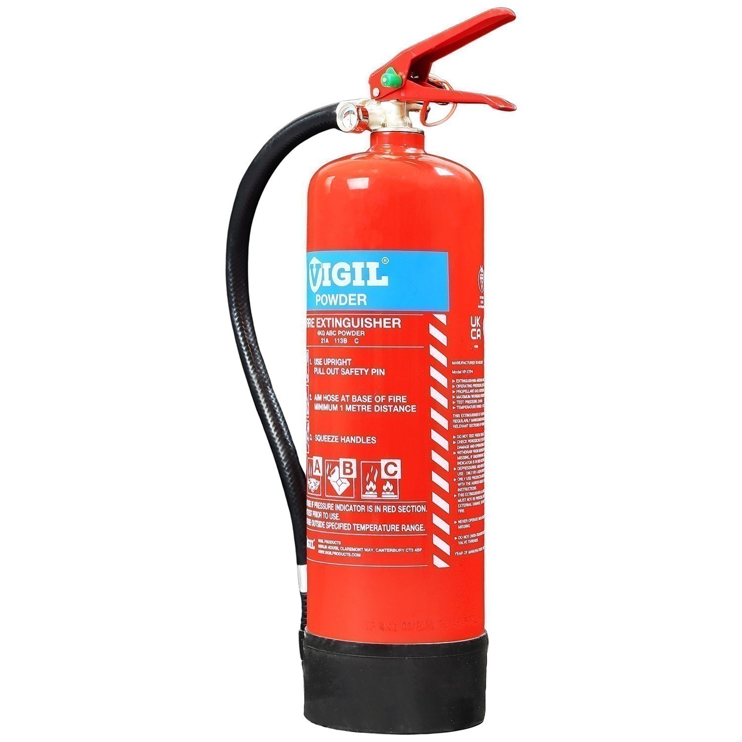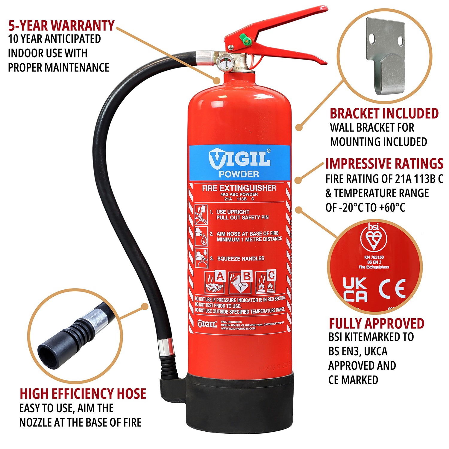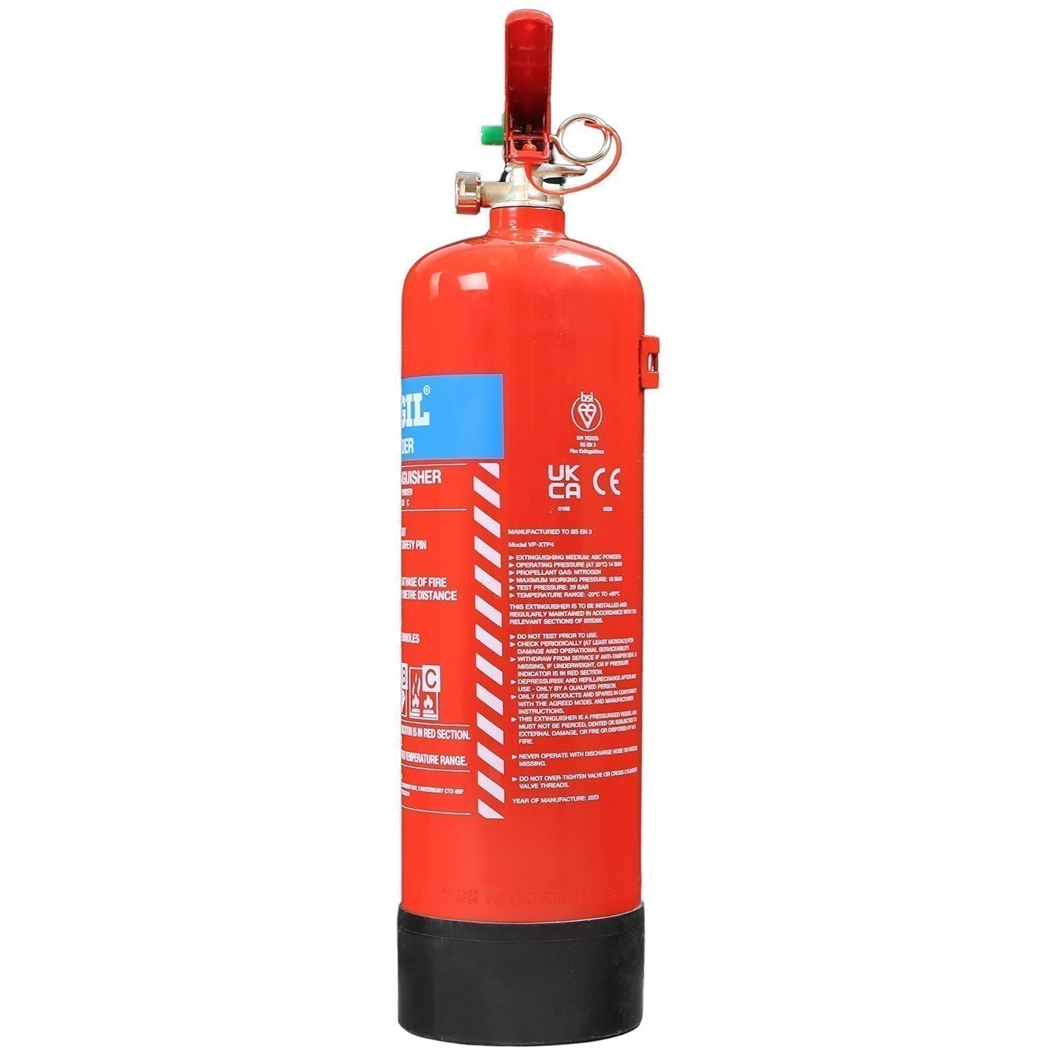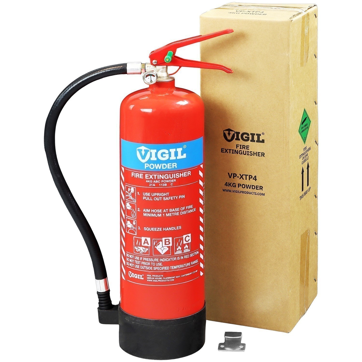 Manufactured for Vigil Products as part of their increasing range, the 4kg Dry Powder Extinguisher has the BSI Kitemark, UKCA Approval and CE Mark that you should expect to see on this type of extinguisher to confirm its quality. With a 5-year warranty on top of that, it is also supplied with a wall bracket as standard so you know it includes everything to need to get this installed.