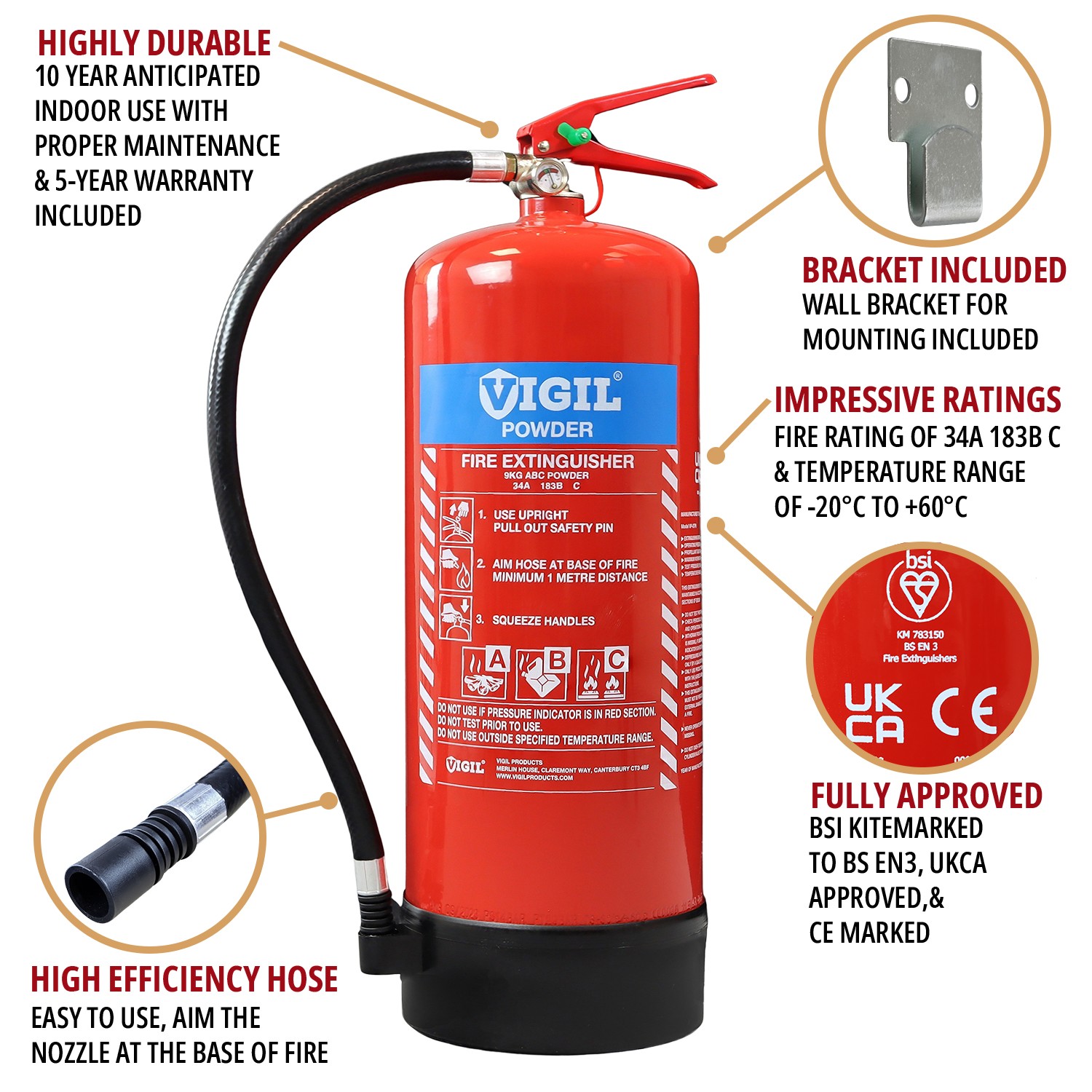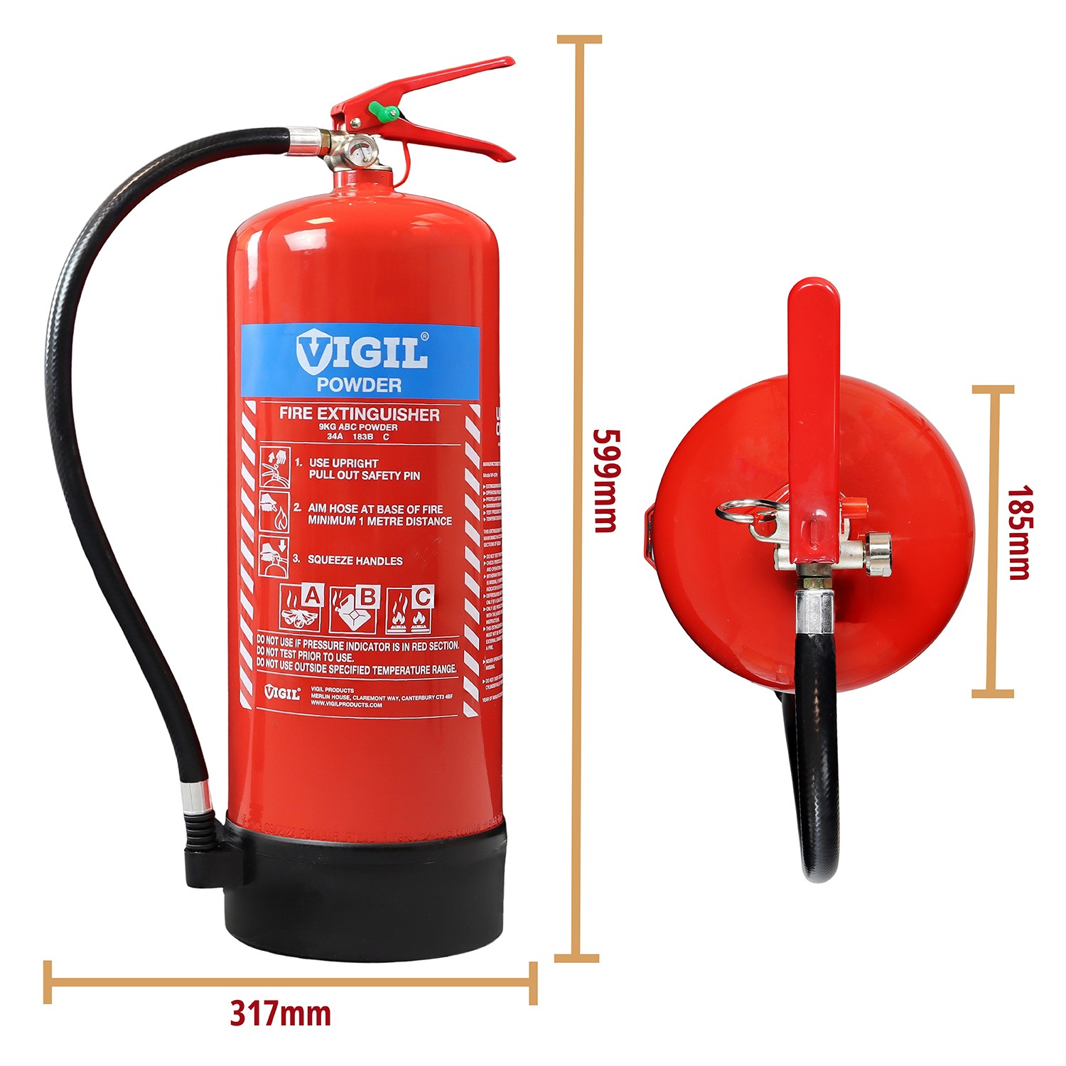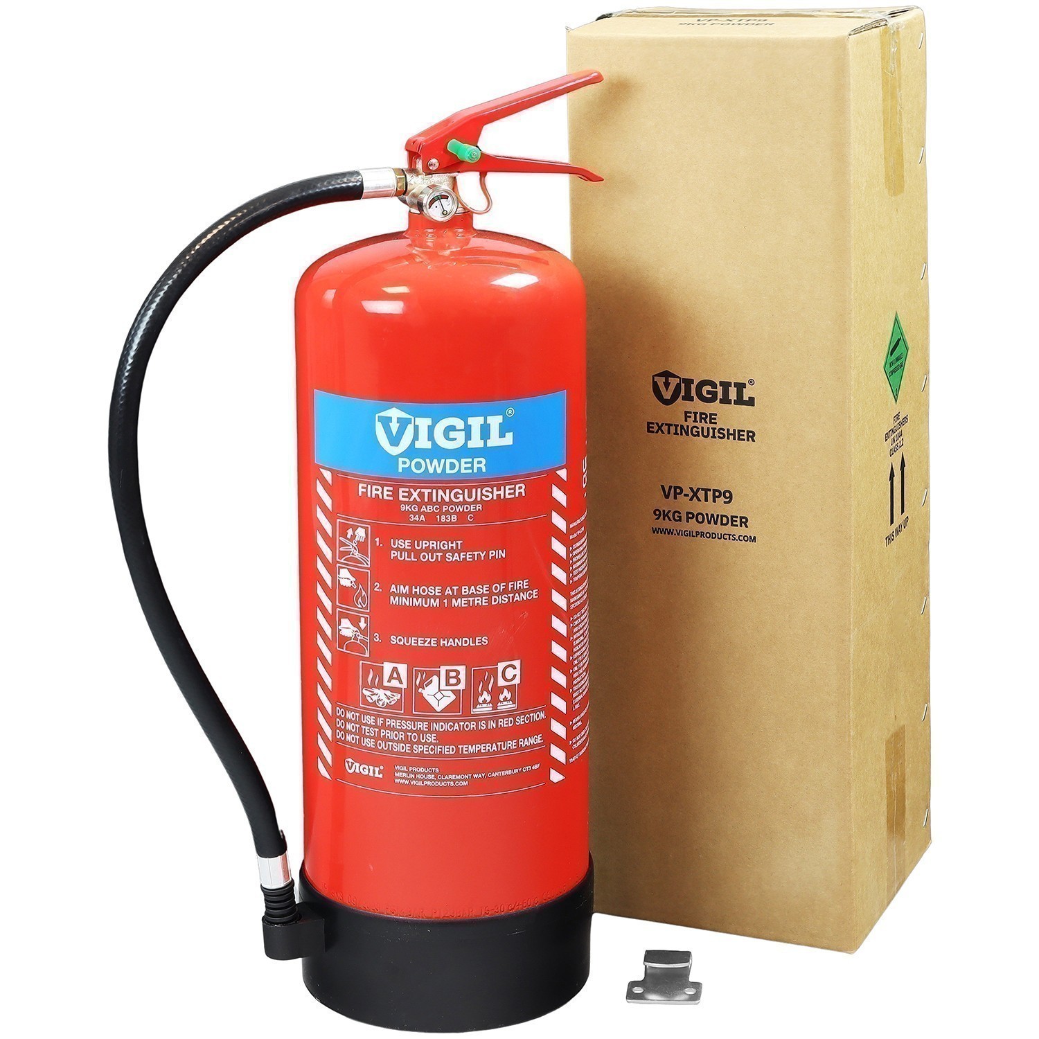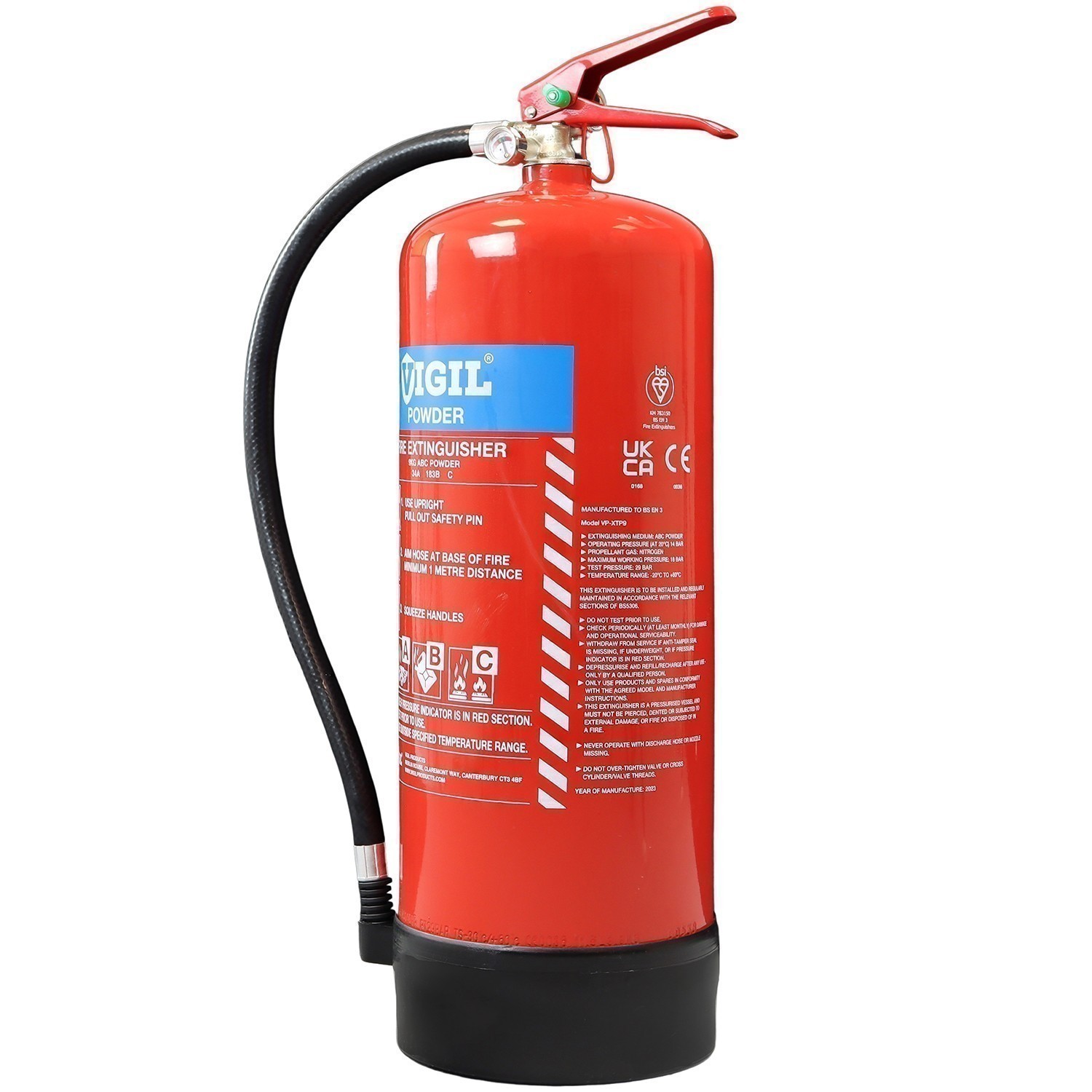 Filled with a multi-purpose ABC powder so you can use it to tackle the most common causes of fire, it comes complete with a wall mounting bracket so you have ready to go in no time. Manufactured for Vigil Products and part of their extensive range, the 9kg Dry Powder Extinguisher can boast having the BSI Kitemark, UKCA Approval and CE Mark.
