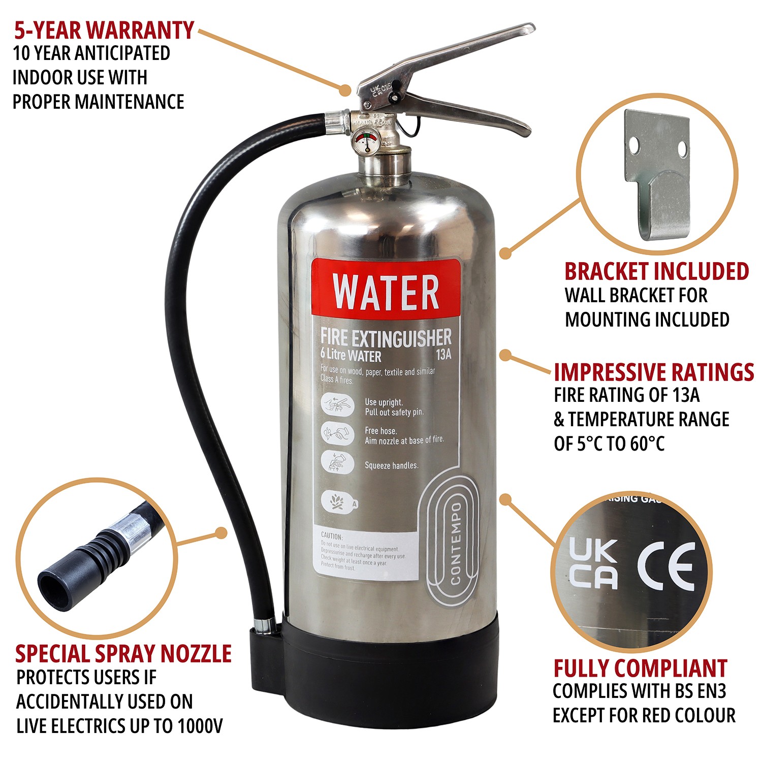 Our chrome 6 litre water fire extinguisher is not chrome at all. Better still, it is made from highly polished stainless steel and is one of our most popular extinguishers for modern offices and retail premises, and despite the colour, is the same as our red 6-litre water fire extinguisher. Part of the Contempo range from Commander, it has a 13A fire rating.