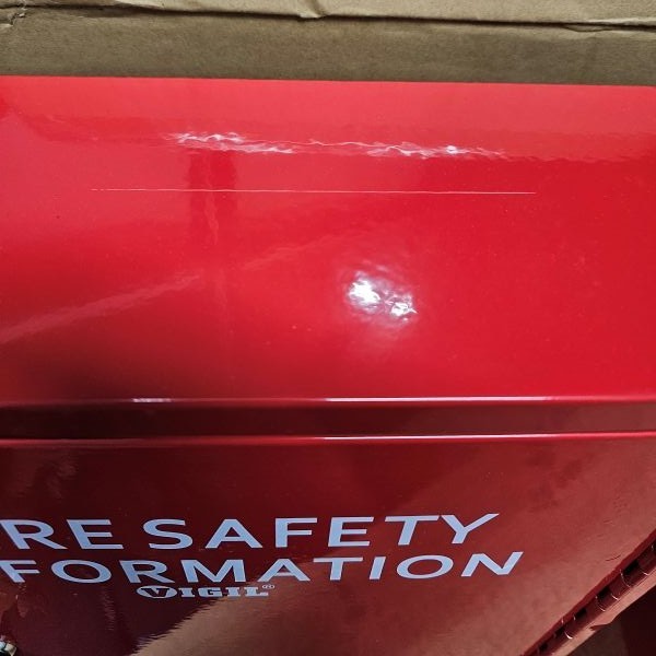 We have one of our very popular Vigil fire document cabinets in our clearance area as it has a small dent to one side and a scratch ontop. It keeps all your important fire safety documents in one place and means you can retrieve them quickly during an evacuation. Big enough to fit A4 size papers, books and ring binders, the back of the door also features four hooks to keep those important keys, such as for fire brigade padlocks on gates.