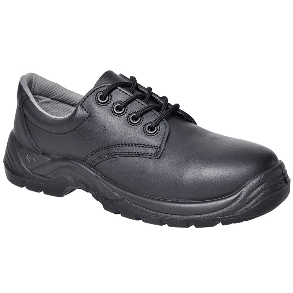 The composite safety toe cap protects against dropped items, and also have a composite midsole which stops an upturned nail penetrating through the shoe. A great alternative to the Dax Safety shoes, the slip resistant outsole prevents slips and trips on ceramic and steel surfaces, the anti-static footwear has a heat, fuel and oil resistant outsole and an energy absorbing seat region. Looking great thanks to the black leather design, they're also comfortable to wear all day long thanks to the cushioned midsole.