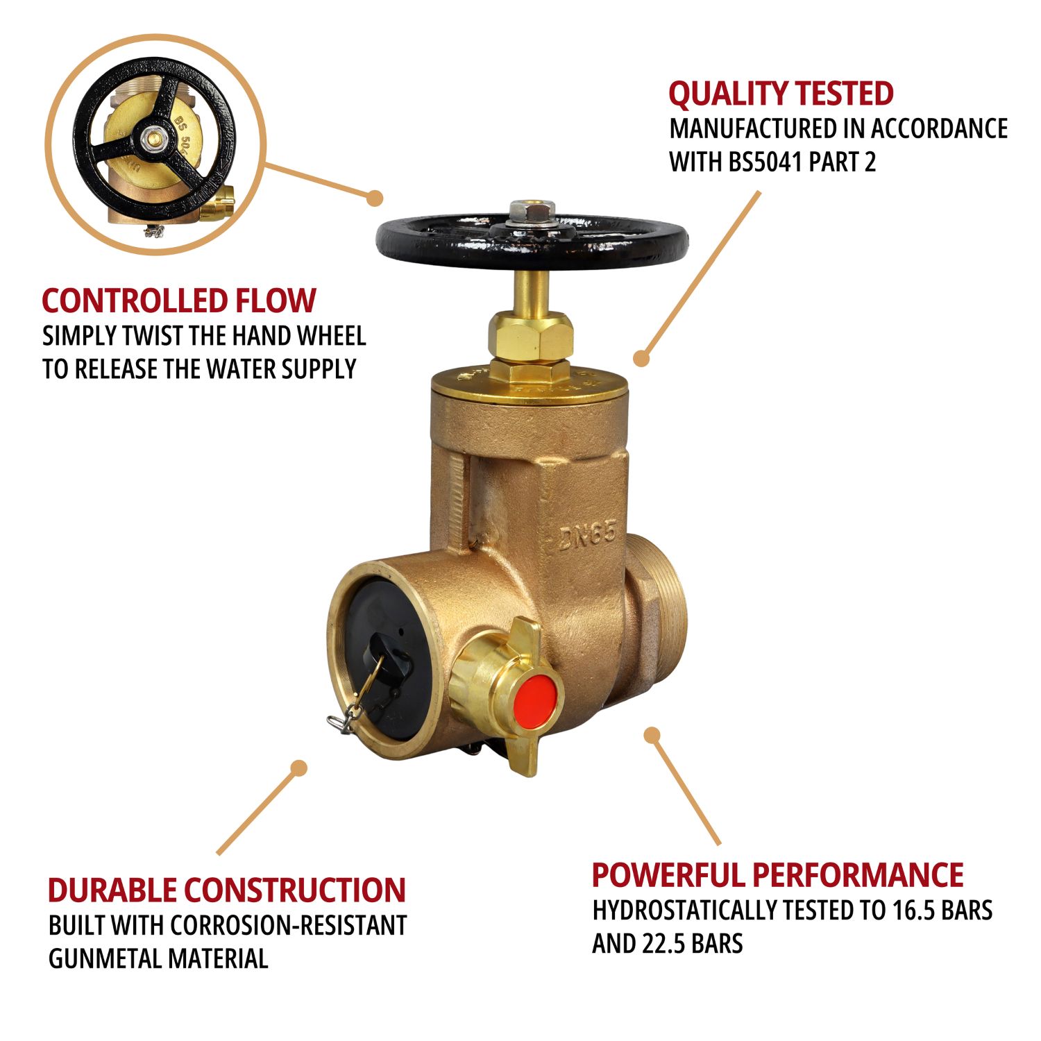 The dry riser gate valve, with a BSP-compatible threaded male inlet, is corrosion-resistant to ensure its longevity, thanks to the gunmetal construction which means it is suitable for onshore and offshore installations. Often called a landing valve, it is manufactured in accordance with BS5041 Part 2 and connects to standard layflat firefighting hoses thanks to the British Instantaneous female outlet.