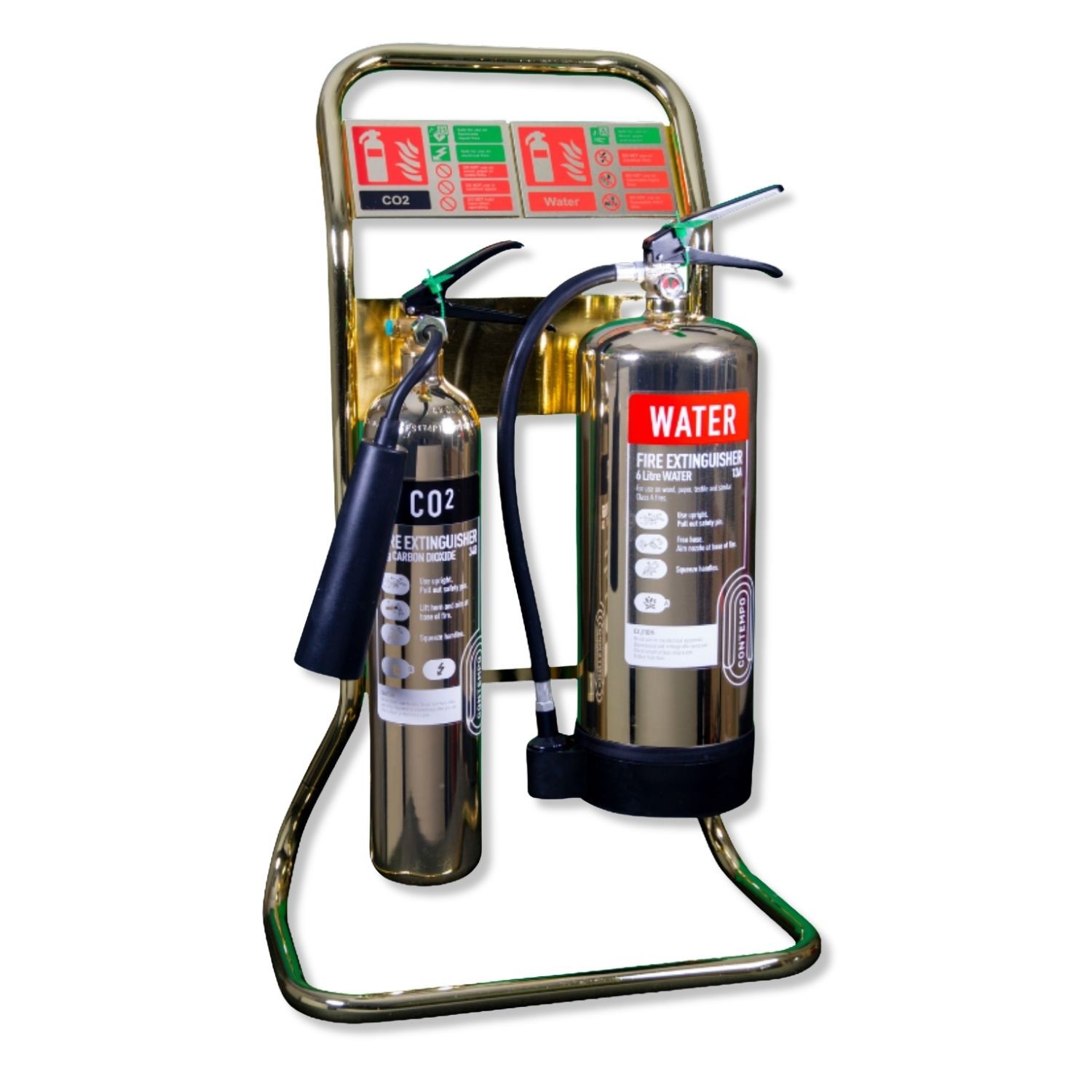 Where a prestigious atmosphere is a priority and wall-mounting your extinguishers isn’t a viable option, the Gold Fire Extinguisher Stand - Double from Checkfire’s Contempo range is the solution for you. Presenting a minimalist, slimline design and premium gold finish, these stands are perfect for housing all types, sizes, and makes of extinguishers, but are particularly suited for use alongside our range of designer gold extinguishers.
