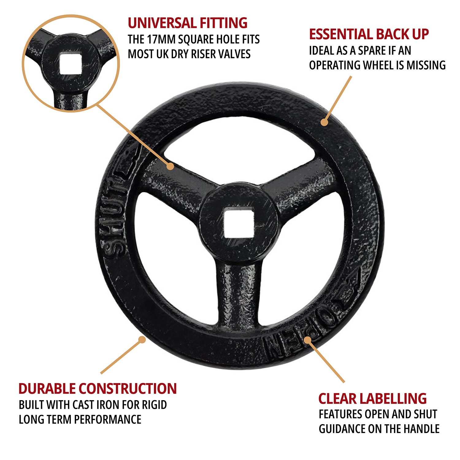 The cast iron hand wheel for landing valves and outlet valves is a necessary dry riser spare should the existing operating wheel on your wheel disappear. With a square hole in the middle, measuring 17mm, which will fit onto most standard wet or dry riser valves in the UK for easy operation to control the flow of water, and clearly labelled so advise which way to turn the wheel.