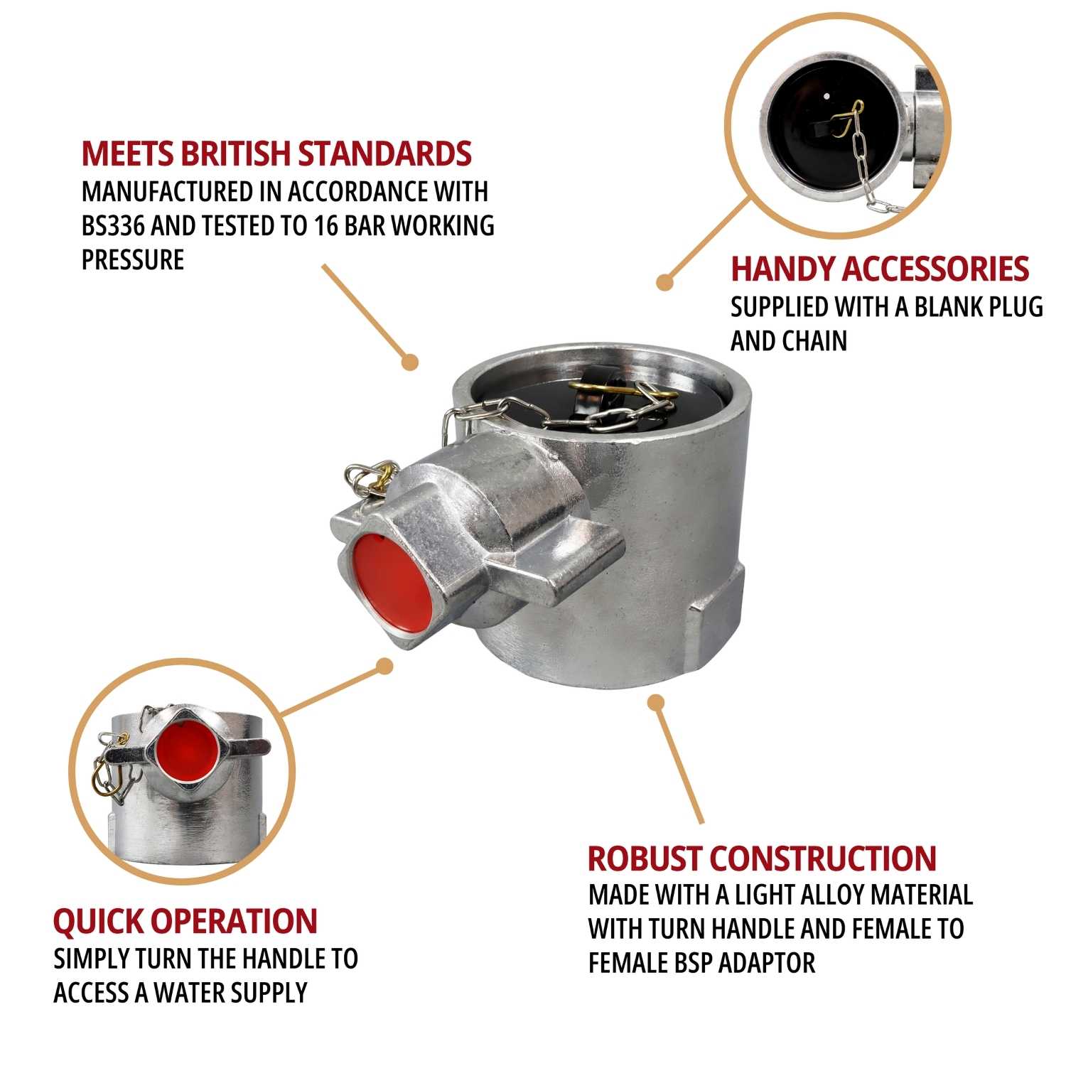 Complete with a blank plug and chain to keep the hose clear of dirt and debris when not in use, the instantaneous adaptor uses a spring-loaded plunger mechanism, operated by the turn handle, to ensure a secure connection under pressure too. Manufactured of light alloy for Vigil Products in accordance with BS 336 with a maximum working pressure of 16 bar, the fire hose adaptor is used by fire brigades and in industrial settings to connect hoses, hydrants, fire engine pumps and other appliances.