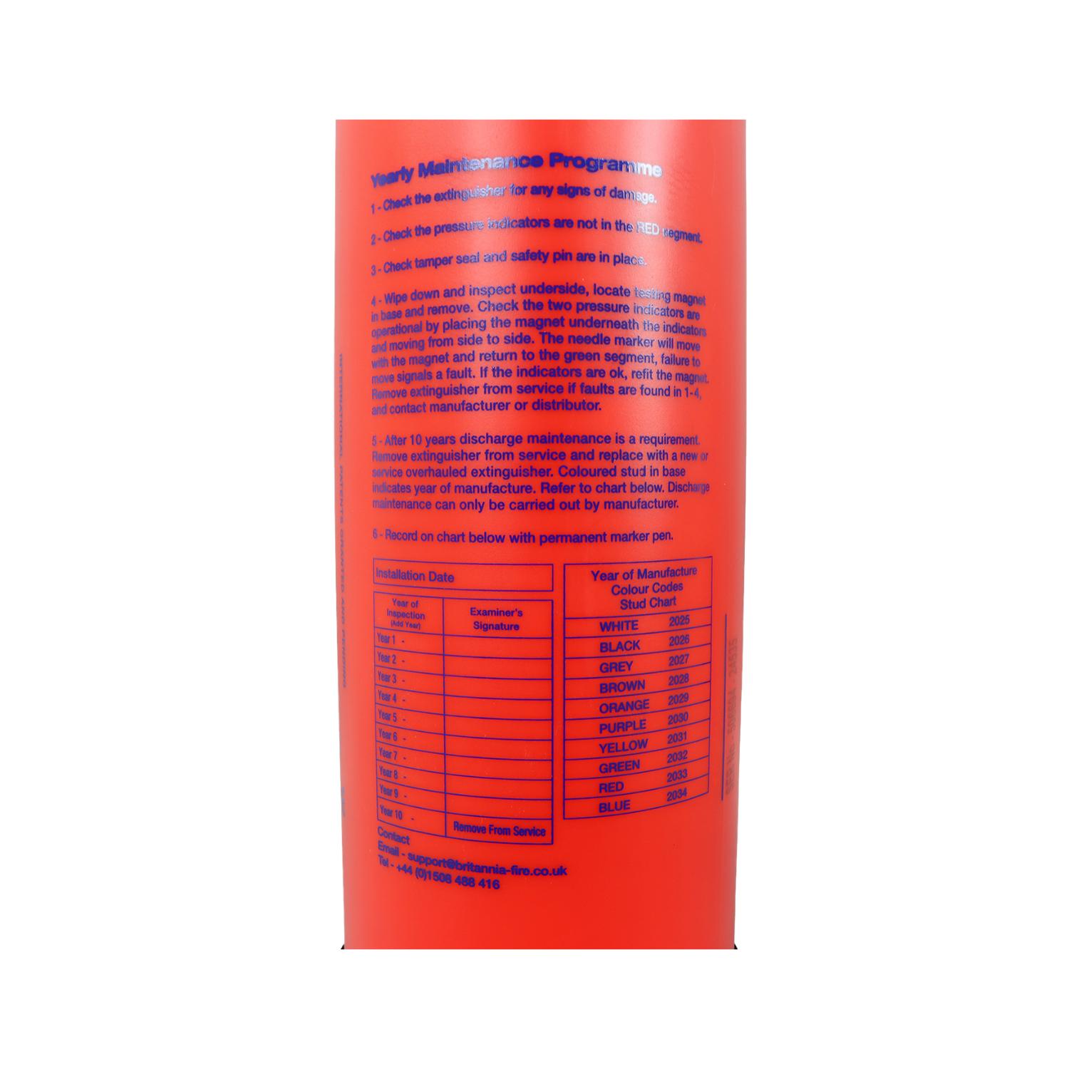 Inspecting the 2kg Powder P50 Fire Extinguisher is simple, with instructions printed on the back to guide you through and allows you to log the maintenance using a marker pen, plus there is an app available for Google and Apple devices which you can use to register and log annual maintenance. The extinguisher features a pressure regulation gauge and a second one to double-check the first, with a special magnet supplied to check that the two gauges are working.