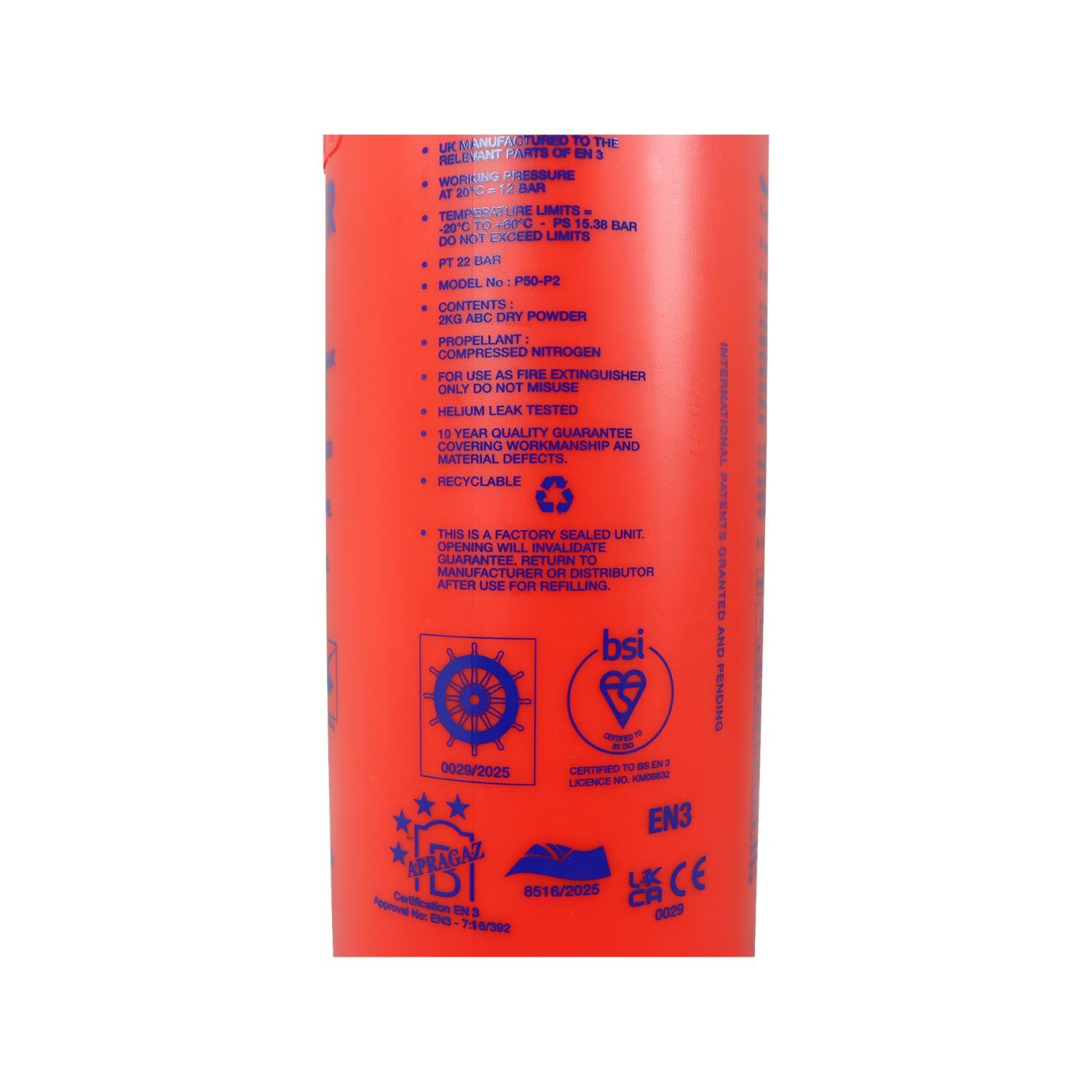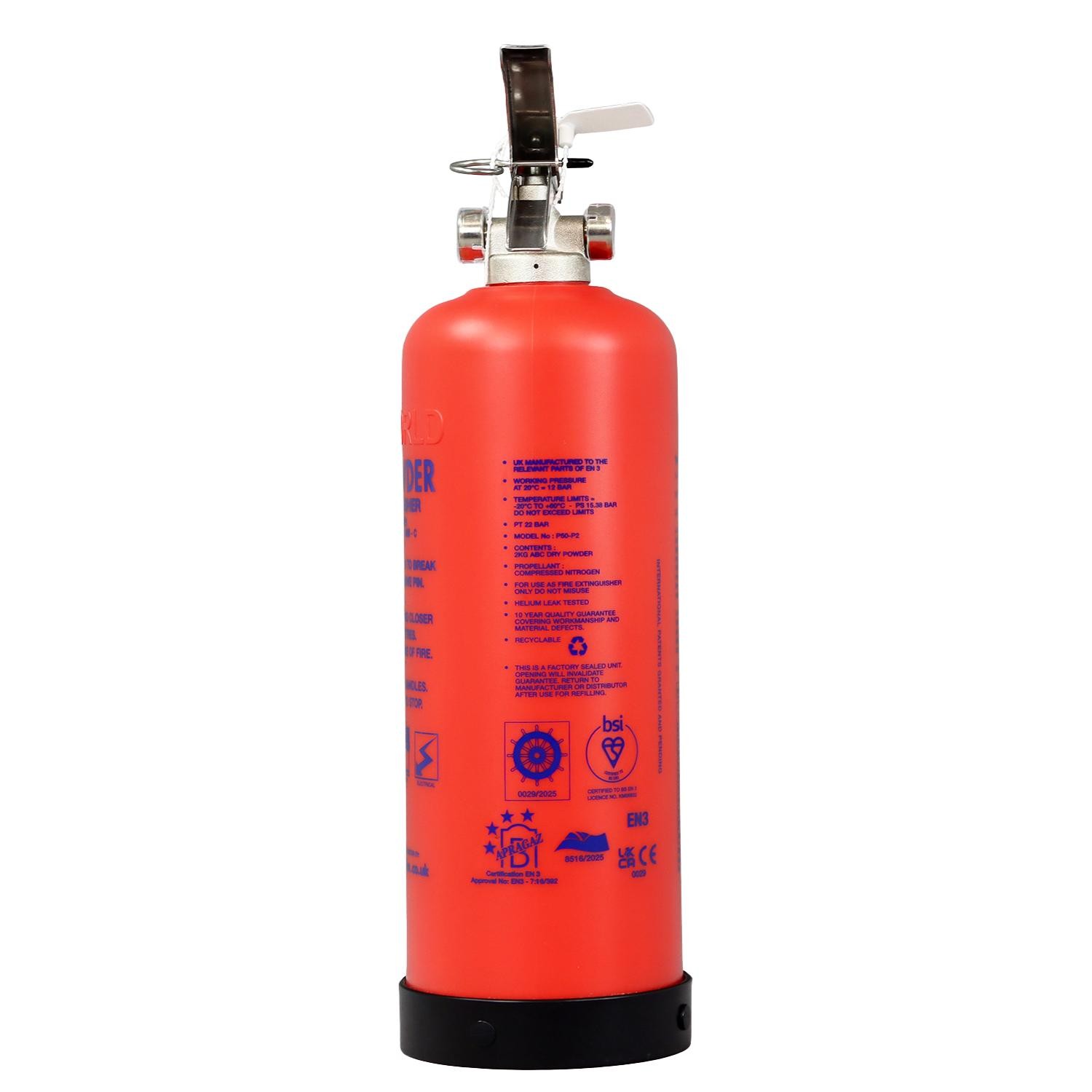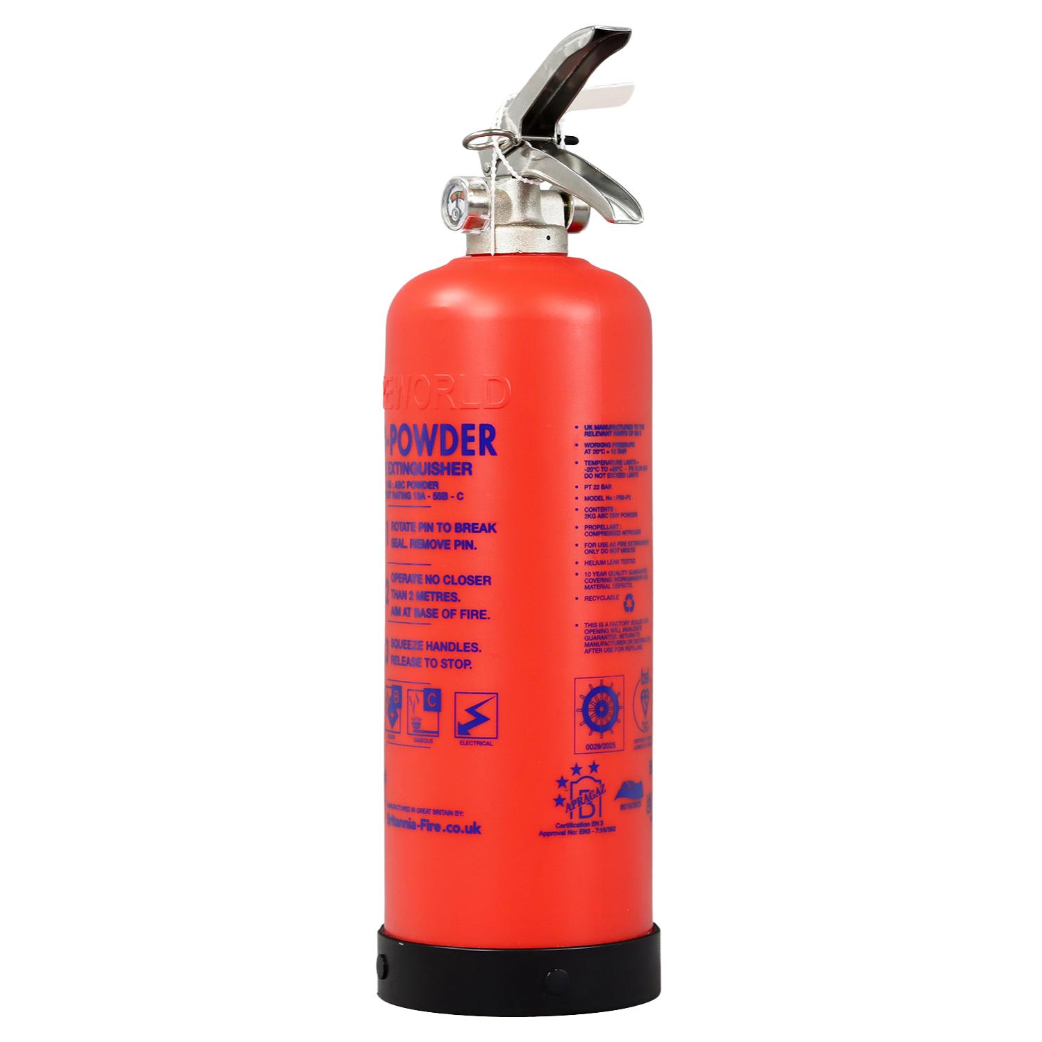 The multi-purpose 2kg Powder Fire Extinguisher is suitable for Class A, B and C fires, and thanks to being non-conductive, around live electrical equipment too. With a fire rating of 13A 55B C, the self-service P50 extinguisher carries the BSI Kitemark and boasts UKCA, EN3, PED and MED approvals.
