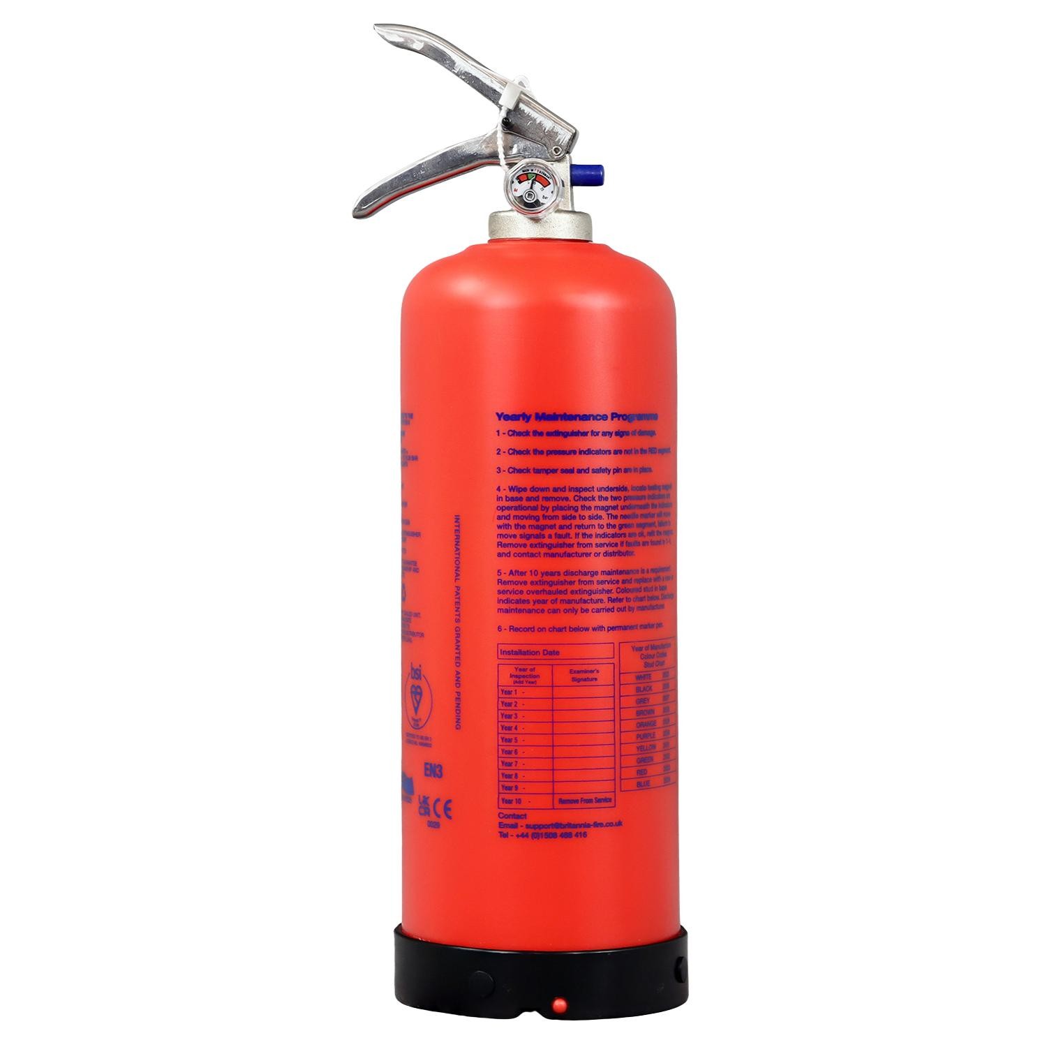 Manufactured in Great Britain by Britannia, each P50 Fireworld fire extinguisher is virtually indestructible as it is constructed of polyethylene and Aramid fibre (Kevlar®). This means it will not corrode like standard steel extinguishers, making them suitable for indoor and outdoor environments whilst remaining lightweight and incredibly durable. With a 20 year lifespan, this requires factory refurbishment at the 10 year mark, which helps to reduce waste and is 100% recyclable at the end of its life.