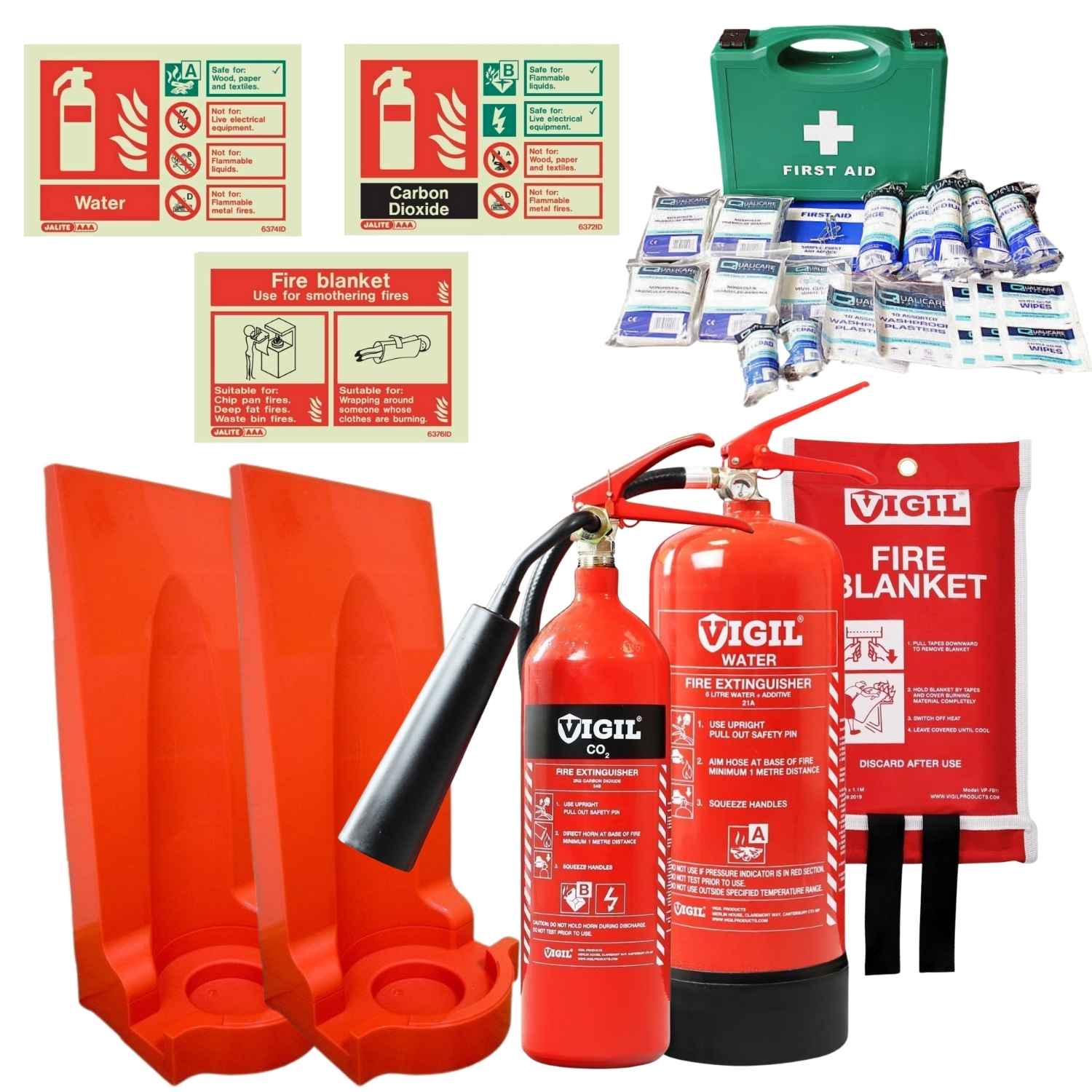 - Bundle includes 1x 2kg CO2 Fire Extinguisher, 1 x CO2 Extinguisher Safety Sign, 1 x 6 litre Water Fire Extinguisher, 1 x Water Extinguisher Safety Sign, 1 x 1.1m x 1.1m Fire Blanket, 1 x Fire Blanket Safety Sign, 2 x Economy Fire Extinguisher Stands, 1 x HSE Workplace First Aid Kit