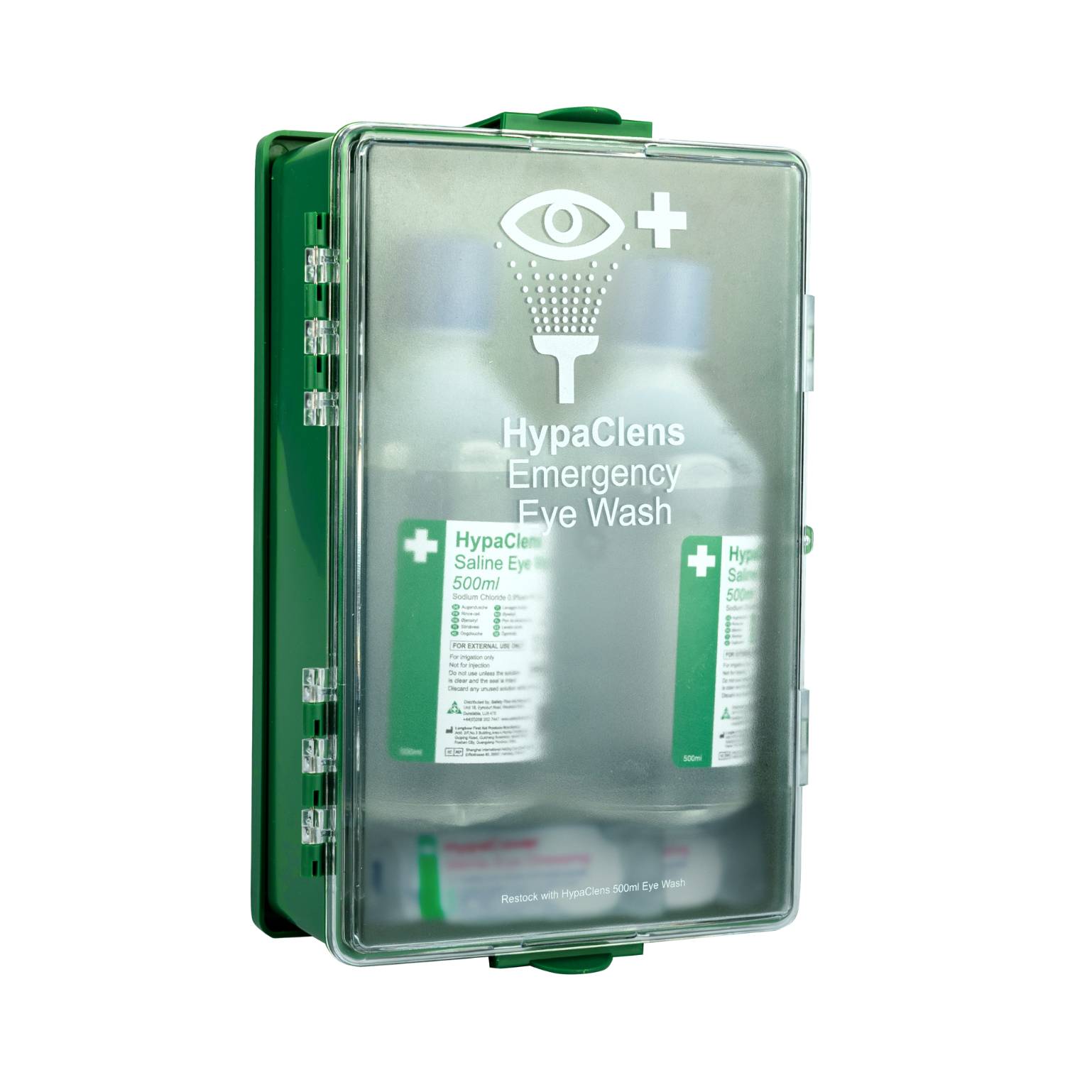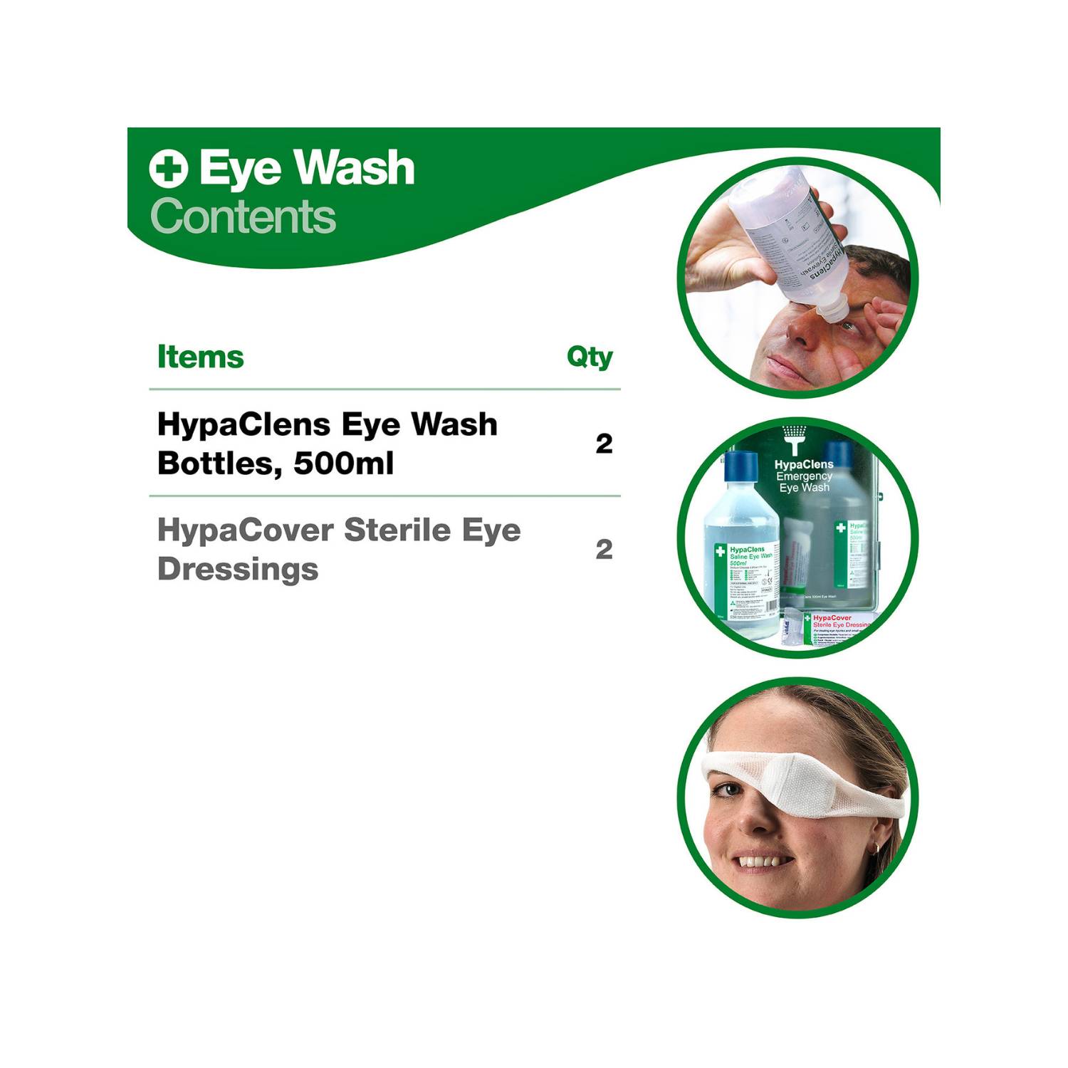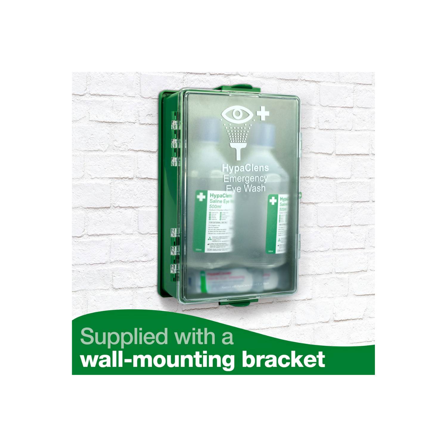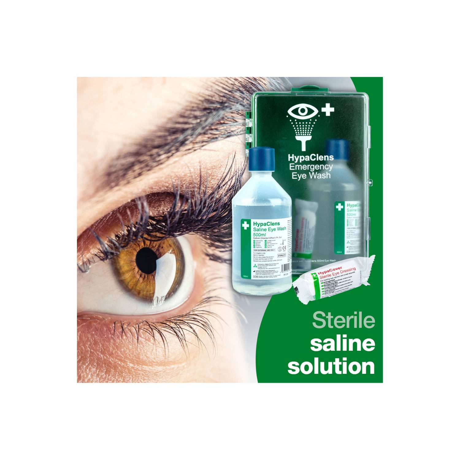 Supplied in a durable green box, the eyewash kit keeps the contents protected and together and features an easy-to-open door to access the contents. Inside, you receive two 500ml eyewash bottles and two eye pad dressings.