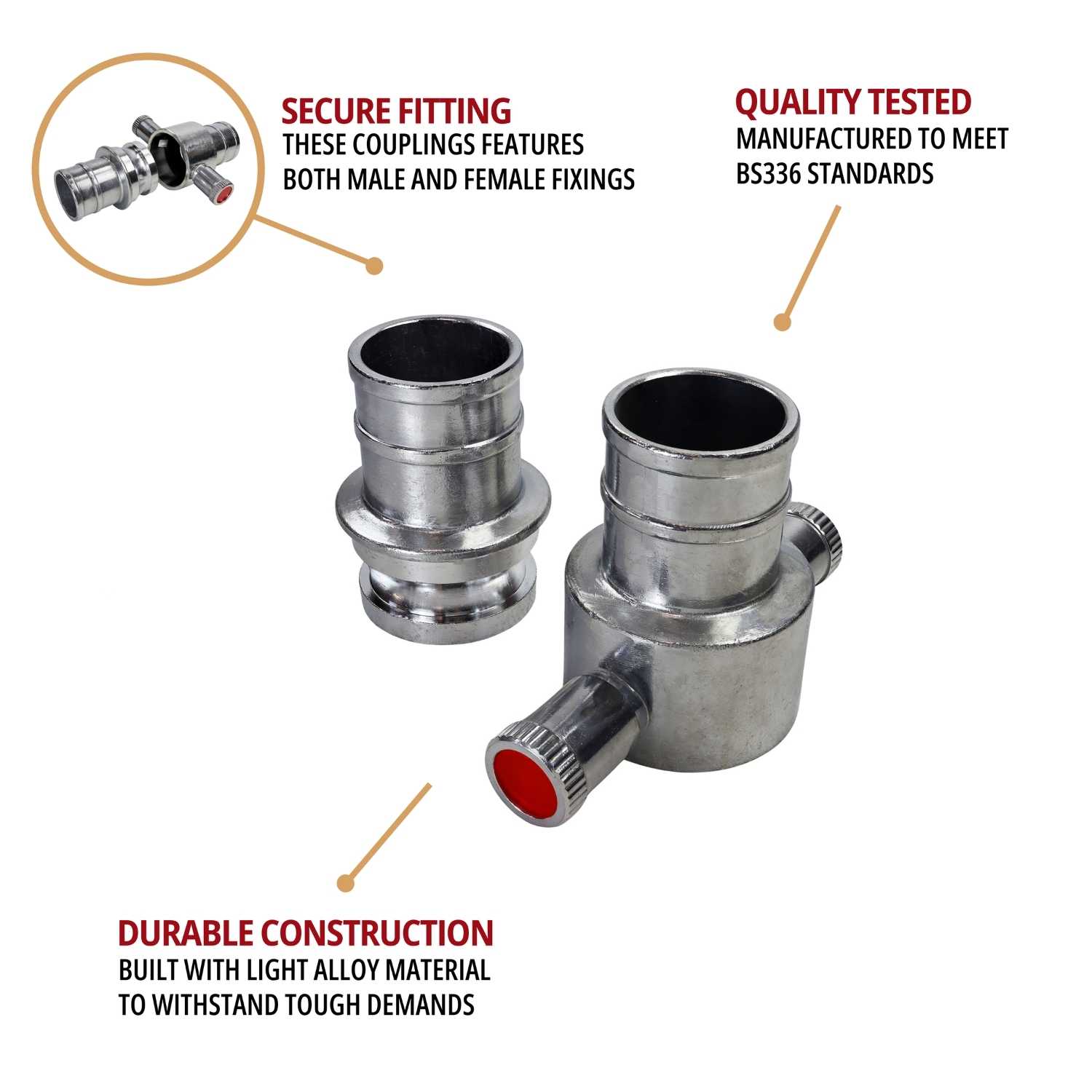 Designed for connecting one layflat fire hose to another to reach even greater lengths, the instantaneous couplings are manufactured to BS336 for fire brigade equipment for 2.5-inch (64mm) diameter hosing. Constructed of light alloy, the fire hose couplings are still durable to withstand the tough demands you expect to use these hoses in.