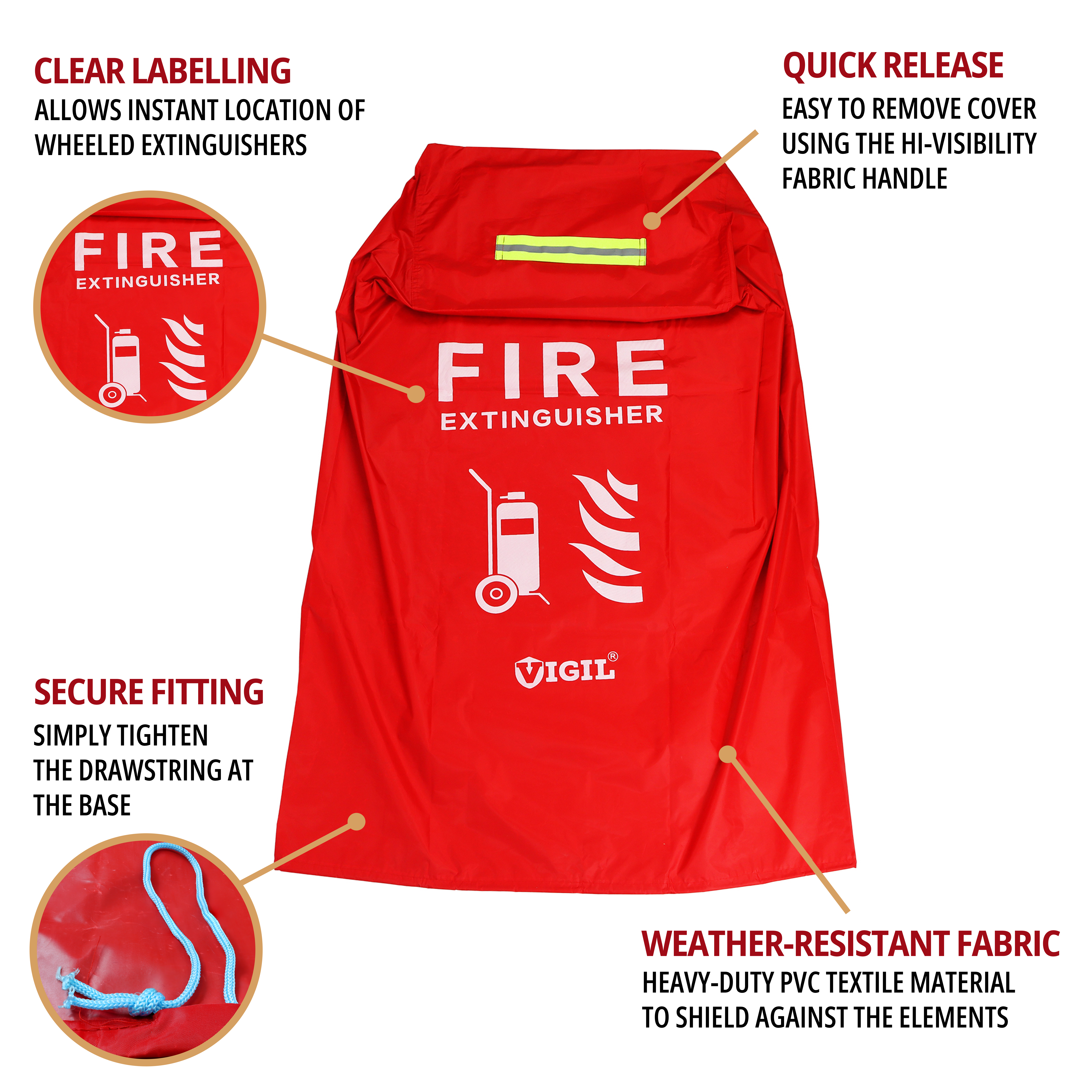 Having a Vigil wheeled fire extinguisher cover is the best way to protect your firefighting investment from the elements, deter misuse, and help to keep it clean from dirt and dust. Available in three sizes for 50kg/50 litre and 100kg/100 litre foam and powder extinguishers, or 10kg and 20kg CO2 units, the mobile extinguisher covers are bright red and clearly labelled for easy identification in an emergency.